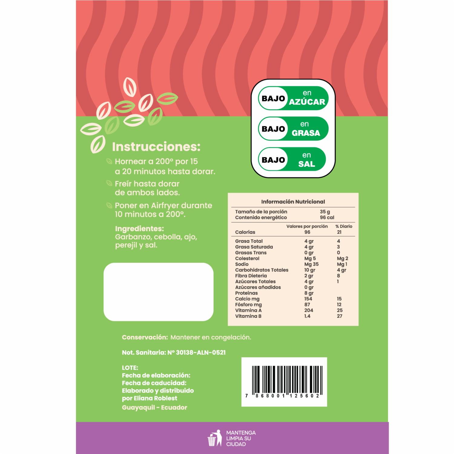 - Falafels de Perejil de facil preparación - 10 unidades por empaque. - Son elaboradas con garbanzo, perejil, ajo, cebolla, sal, pimienta y comino. - 100% naturales, vegetarianos, veganos y libres de gluten. - Son ideales como proteina vegetal, para comer en el colegio o en el trabajo
