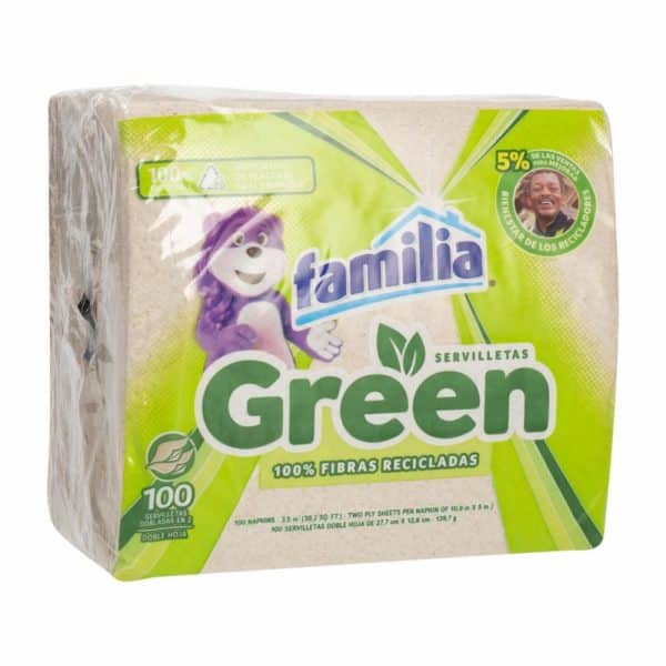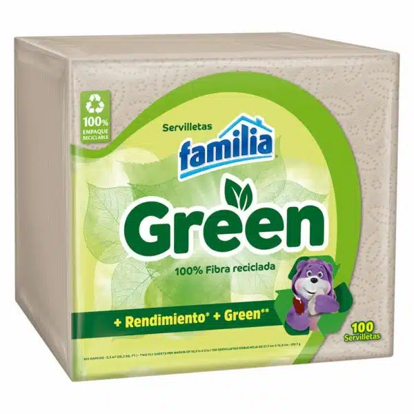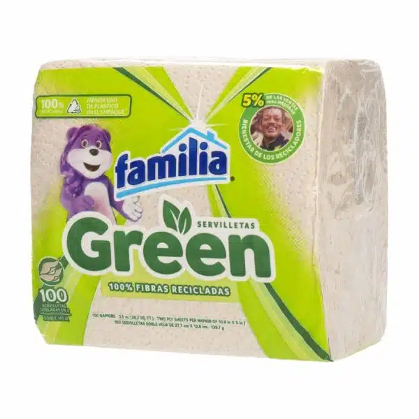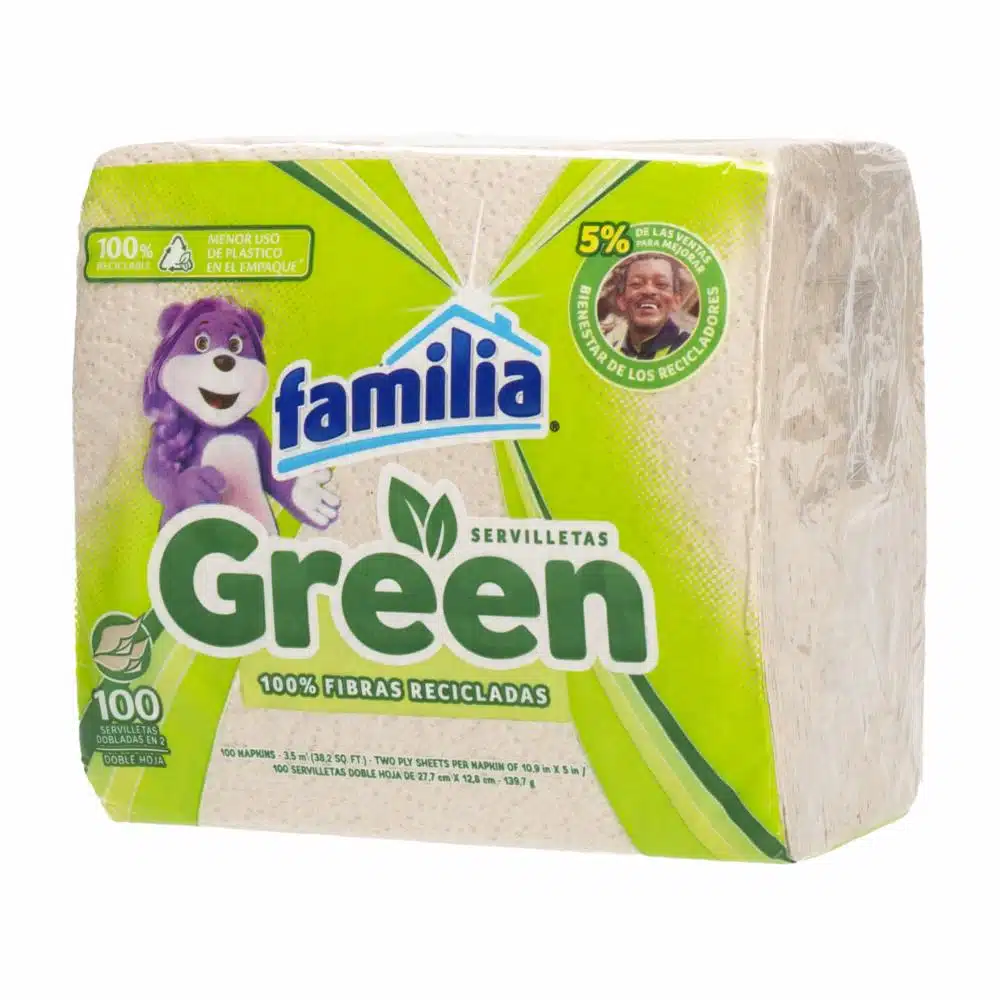 Servilletas de papel hechas 100% con fibra reciclada, además, puedes reciclar su empaque. Destinamos el 5% de las ventas de Familia Green en kits de bioseguridad para los recicladores de base