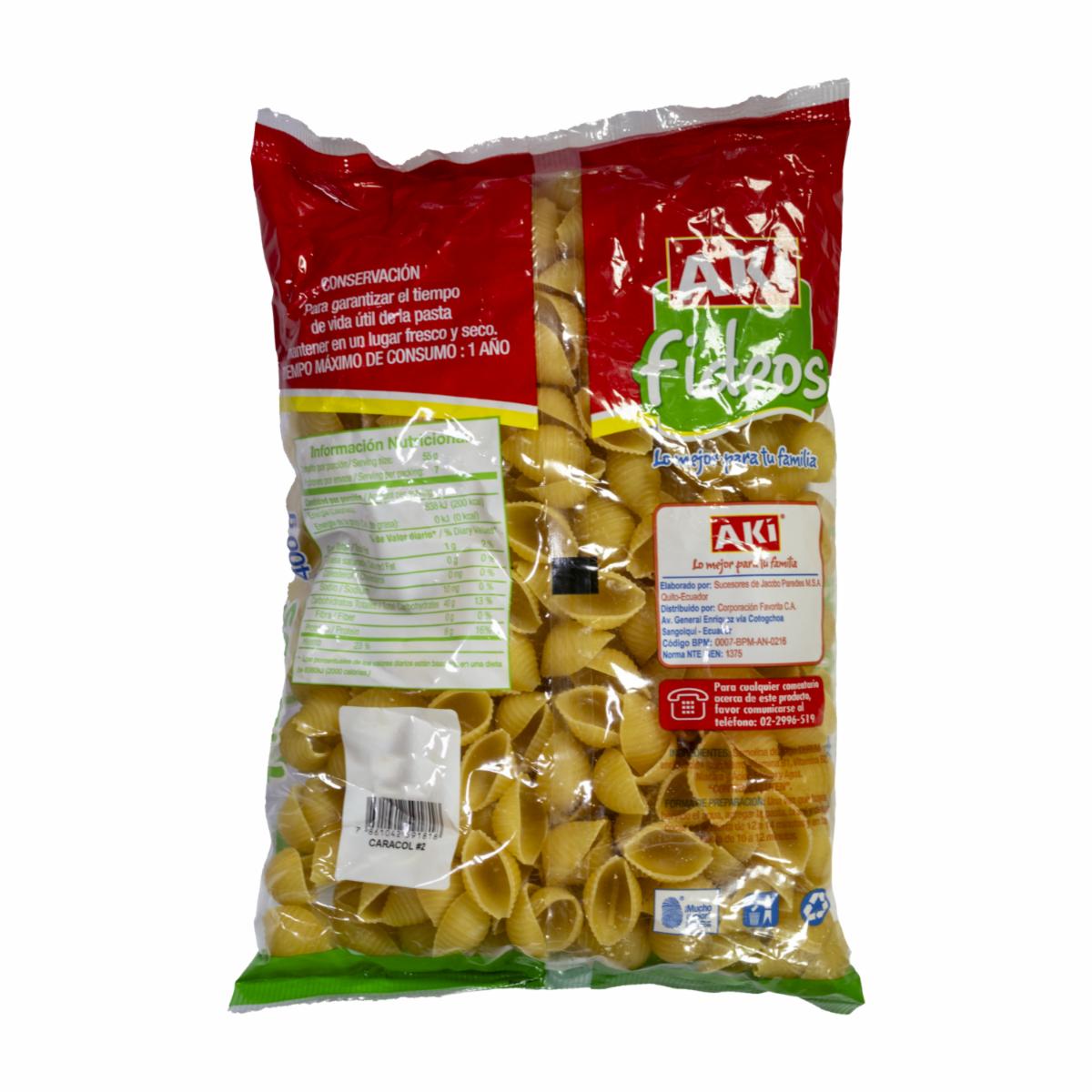 - Los "Fideos Caracol No. 2" de la marca AKI son una variedad de pasta en forma de caracol, con una textura y forma que los hace ideales para retener salsas y condimentos. Estos fideos son apreciados por su versatilidad en la cocina y su capacidad para combinar con una variedad de ingredientes y sabores