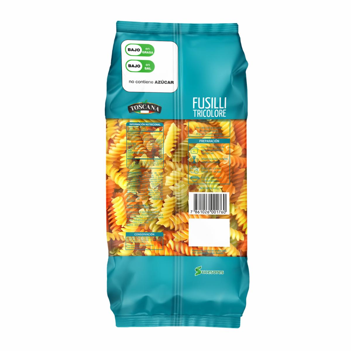 consultando preciosFideo Fusilli Tricolore TOSCANA 400 G – TOSCANA. Disponible en nuestros locales. Precio y stock pueden variar según la tienda.