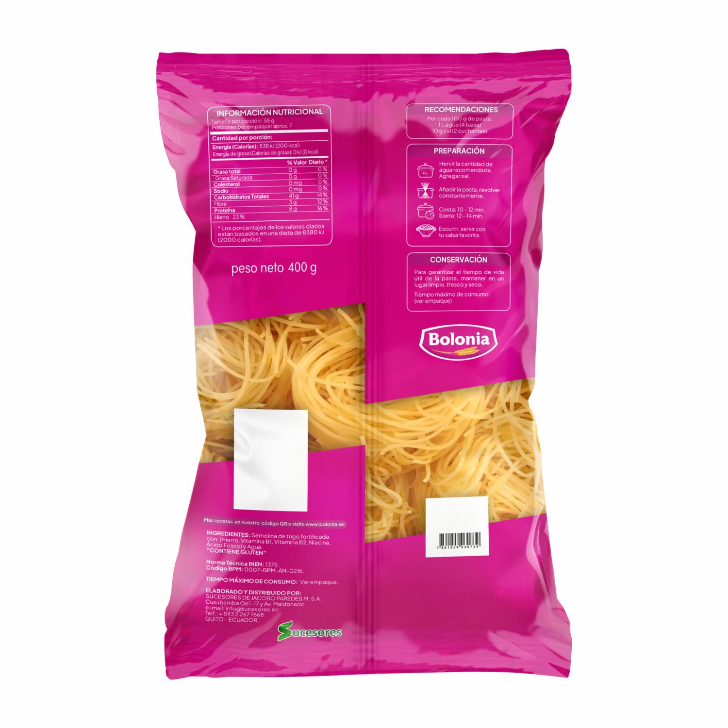 Fideo Nido Cabello BOLONIA 400 G – BOLONIA. Disponible en nuestros locales. Precio y stock pueden variar según la tienda.