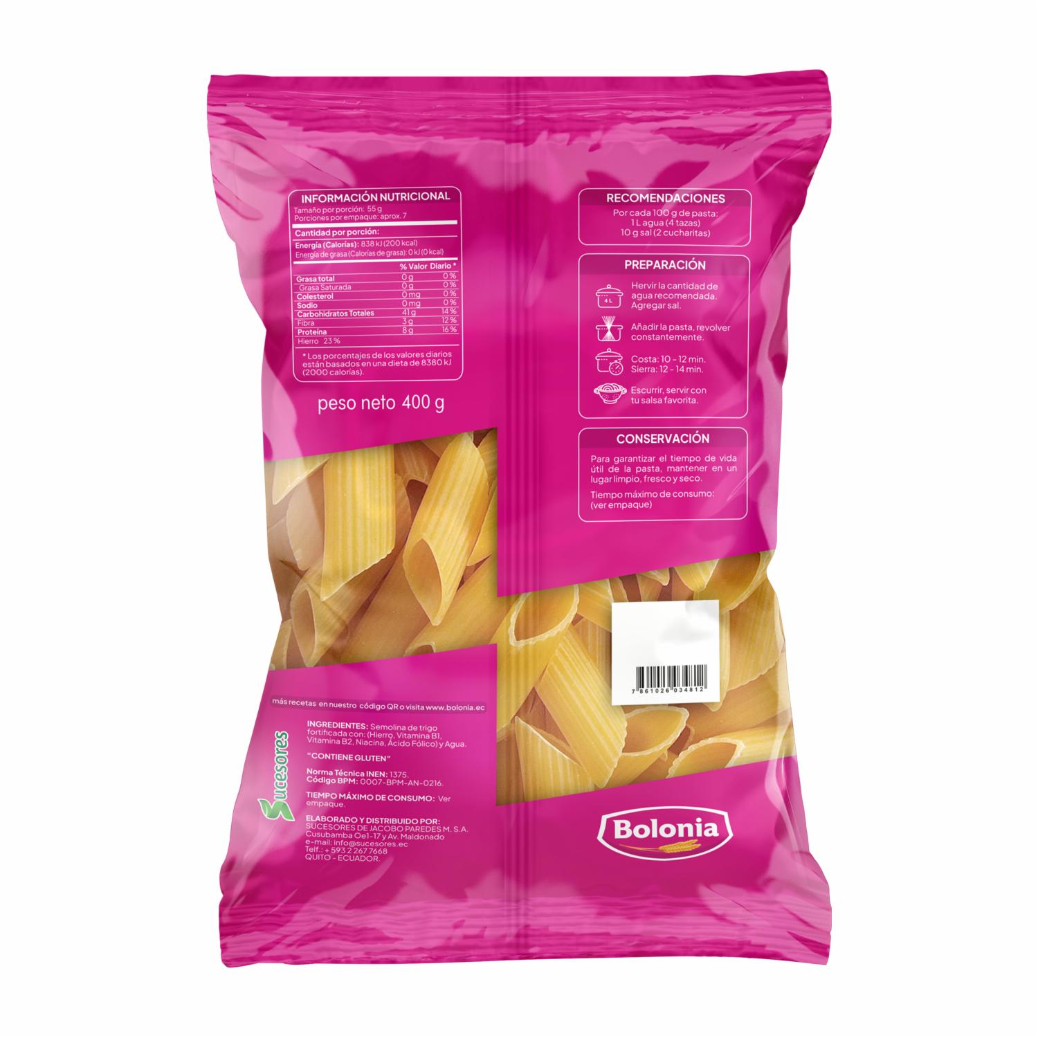 Fideo Pluma Grande BOLONIA 400 G – BOLONIA. Disponible en nuestros locales. Precio y stock pueden variar según la tienda.