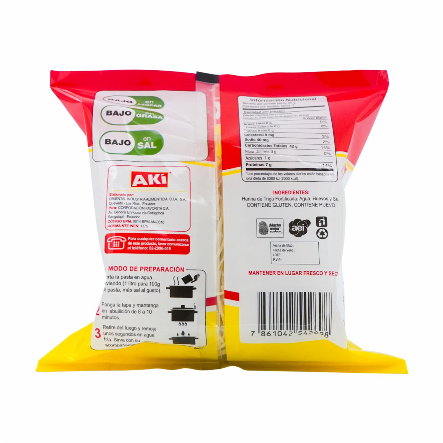 Fideo Tallarín Tipo Chino Fino AKÍ 380 G – AKÍ. Disponible en nuestros locales. Precio y stock pueden variar según la tienda.