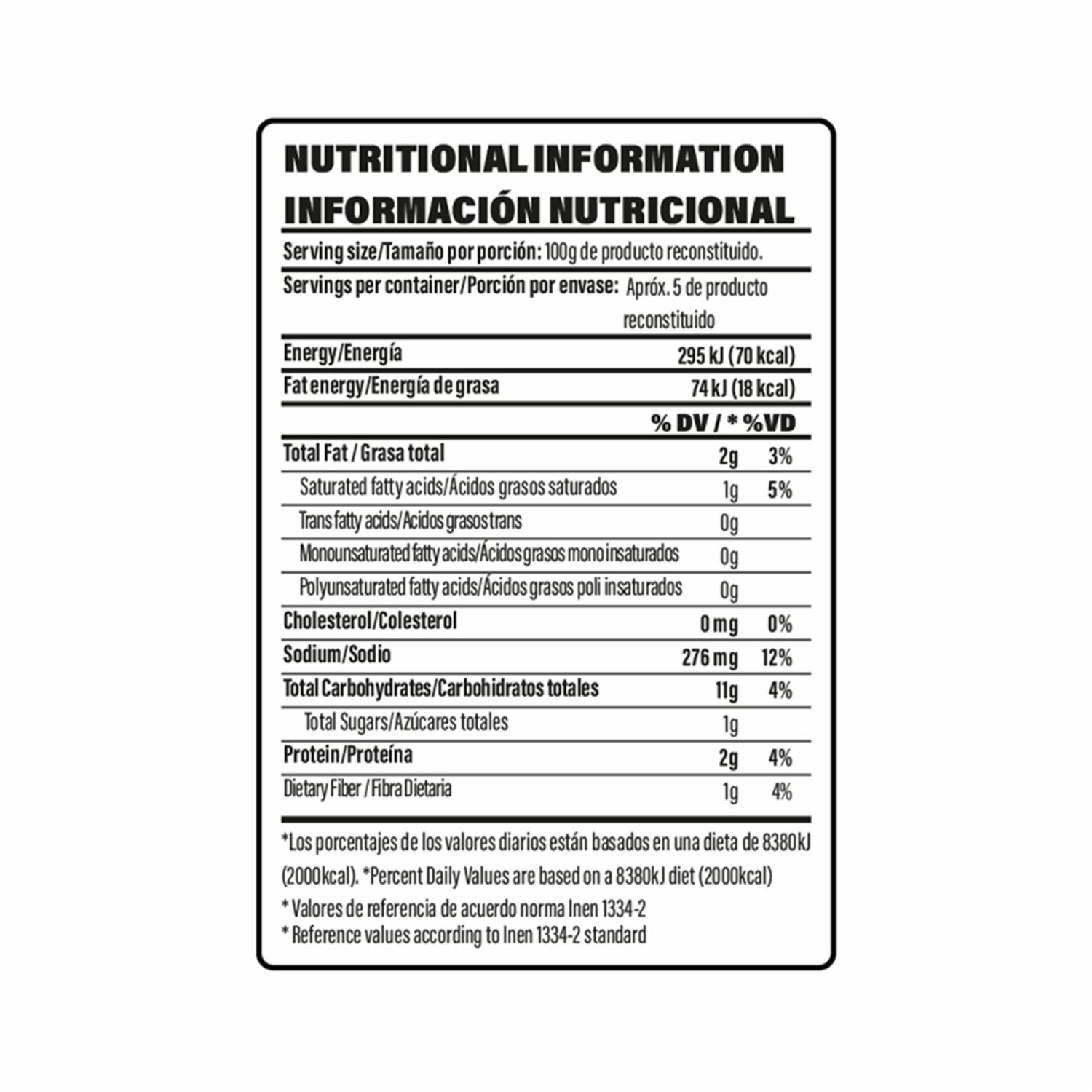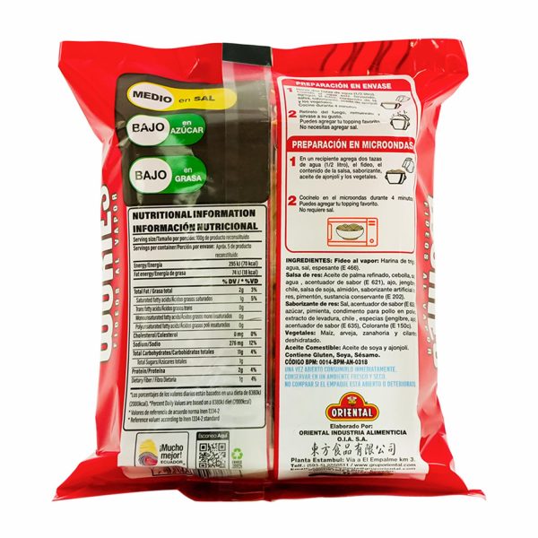 No contiene grasas trans. No contiene colesterol. Listo en 4 minutos. Contiene saborizante, salsa de carne, aceite de ajonjolí y vegetales deshidratados. Un producto de La Oriental
