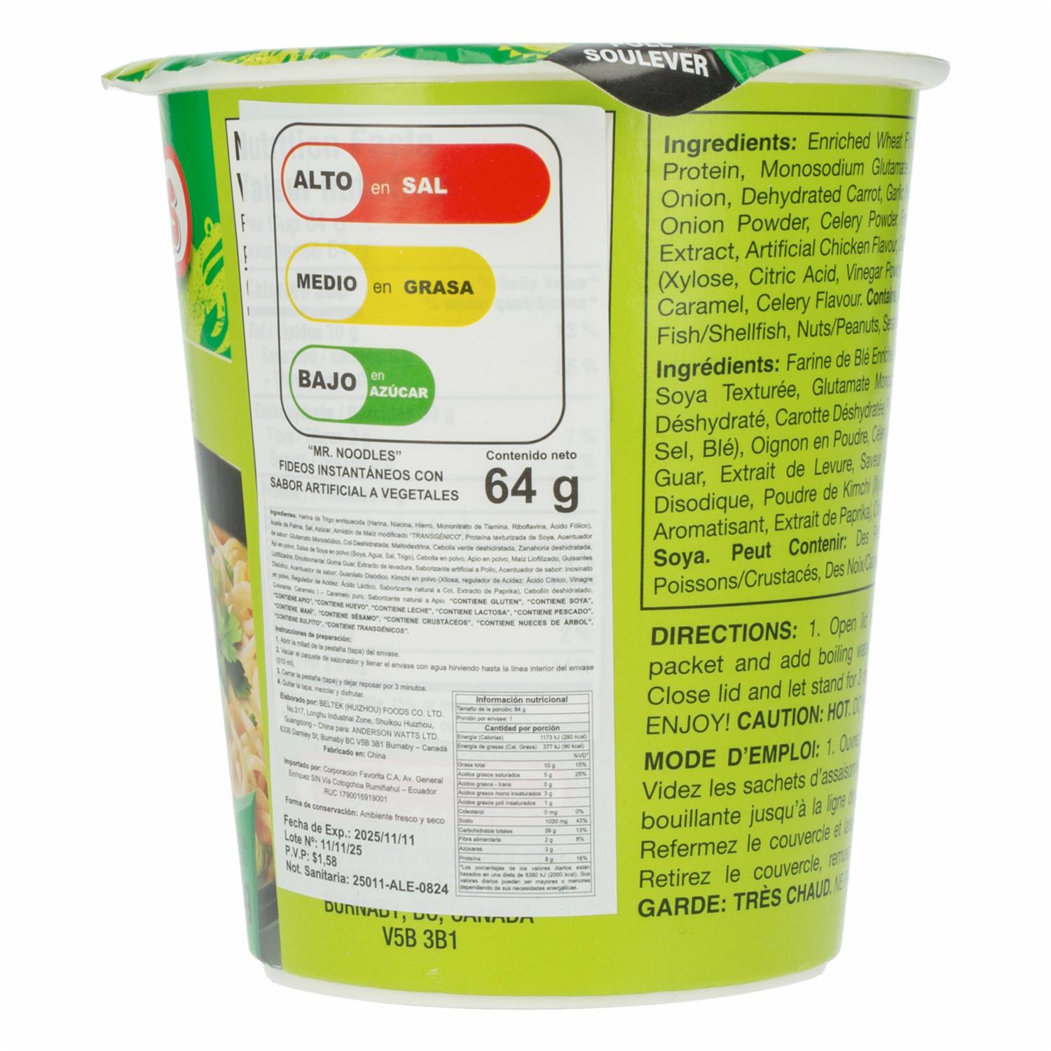 Fideos Instantáneos En Copa Sabor A Vegetales MR. NOODLES 64 G