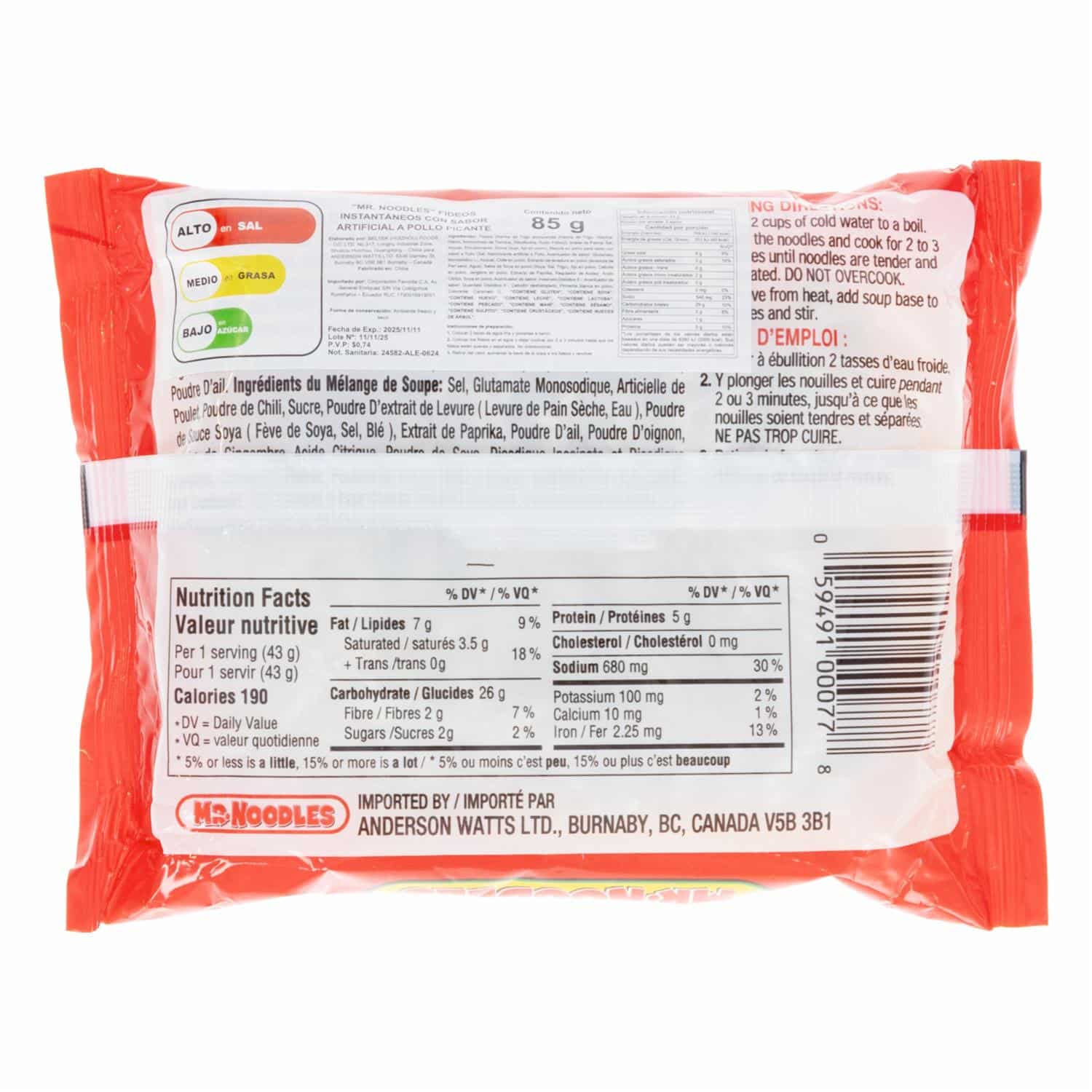 Fideos Instantáneos Sabor A Pollo Picante MR. NOODLES 85 G