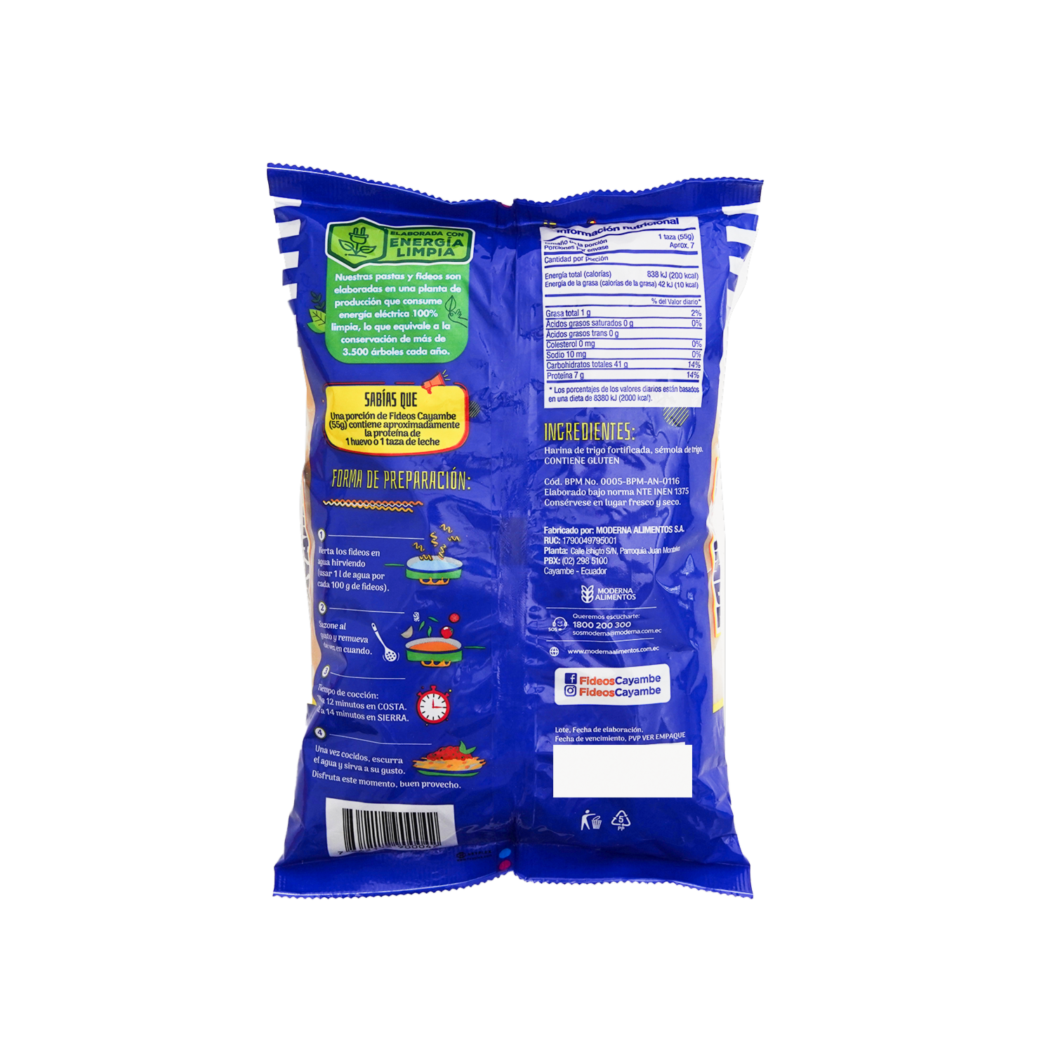 - Explora la tradición culinaria con los Fideos Macarrón Chico CAYAMBE en su presentación de 400 g. Estos versátiles y deliciosos fideos son el acompañamiento perfecto para una variedad de platillos, desde las recetas más clásicas hasta creaciones culinarias más innovadoras