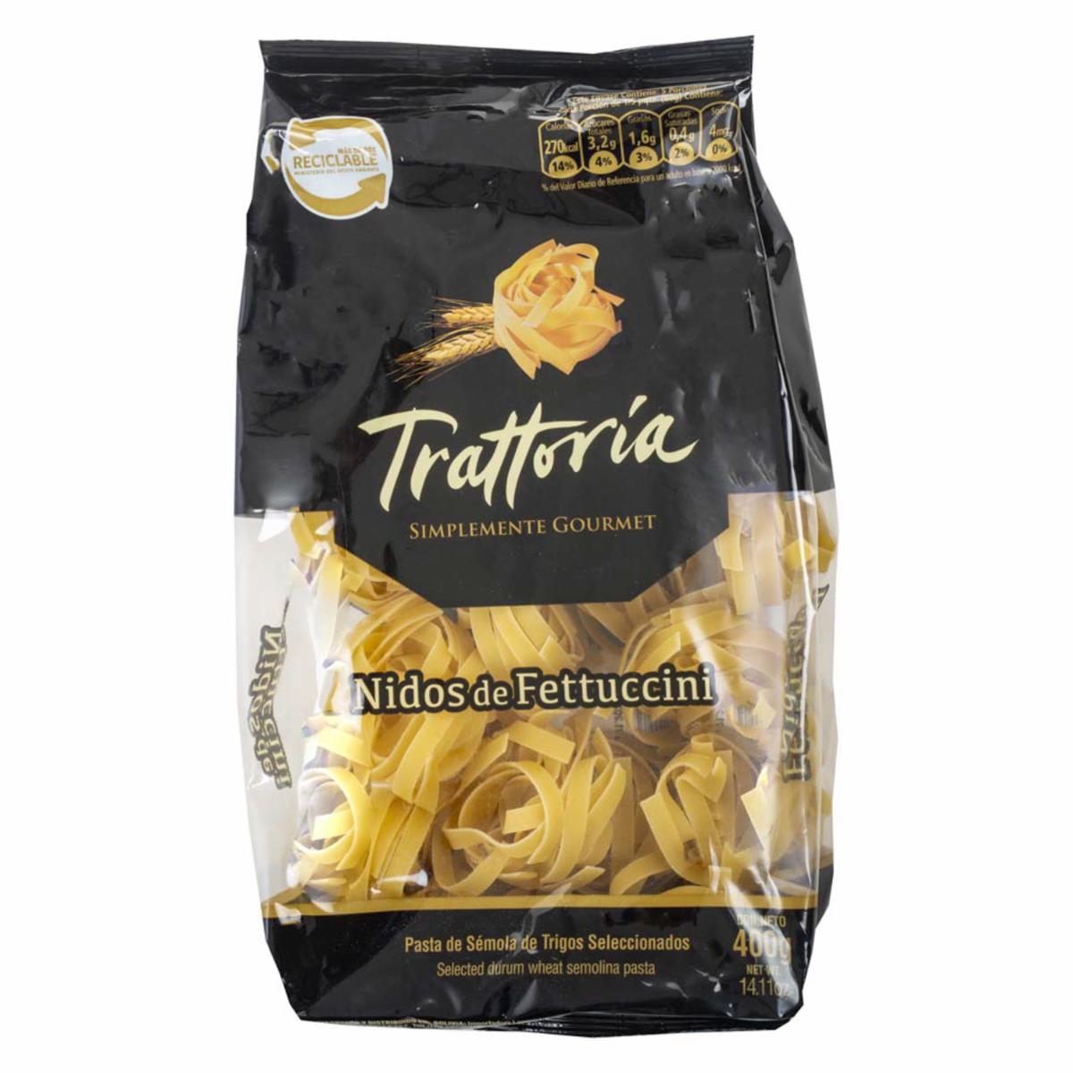 consultando preciosFideos Nidos Fettuccine TRATTORÍA 400 g – TRATTORIA. Disponible en nuestros locales. Precio y stock pueden variar según la tienda.