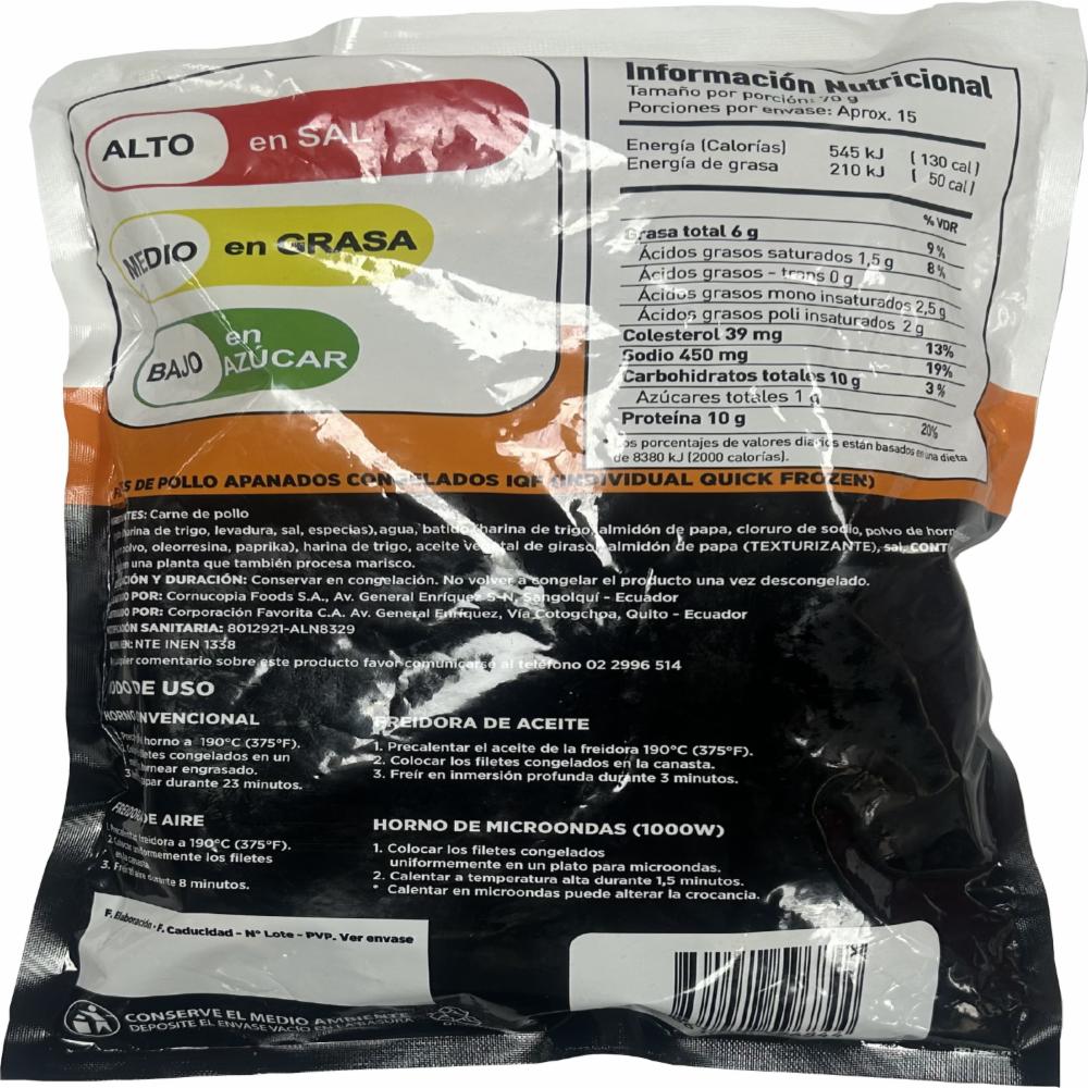 Filete de pollo cocinado y congelado con crujiente cobertura Elaborados con carne de pollo Sin conservantes y 0% grasas trans Listos para calentar y servir Congelados IQF
