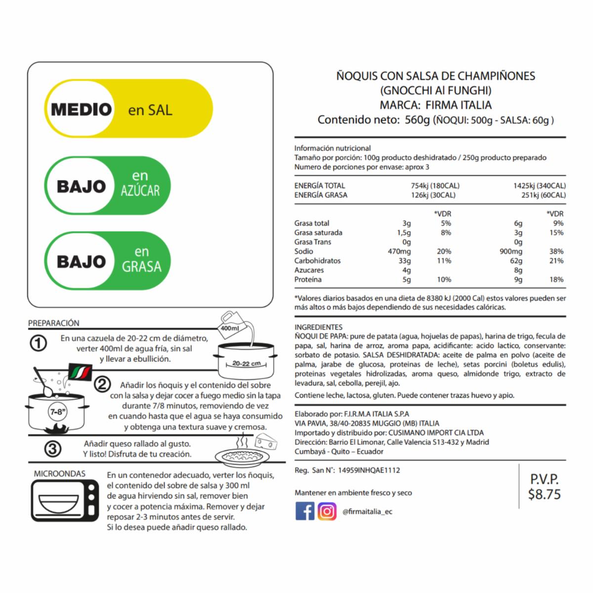 - La caja contiene 2 sobres: 1 sobre de ñoquis y 1 de salsa instantánea sabor a queso