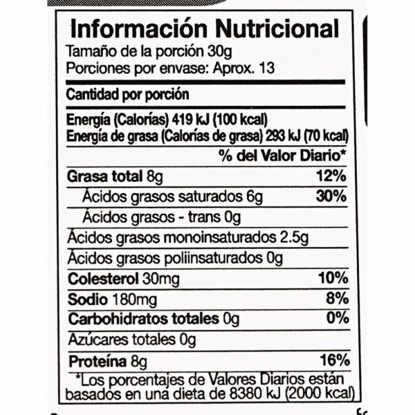 Queso madurado de pasta semidura de color naranja, y totalmente cerrada, elaborado con leche pasteurizada de vaca, Sánduches frios o calientes. Para bocadillos en tablas de quesos. Para acompañar comida mexicana como fajitas y tacos. En hamburguesas