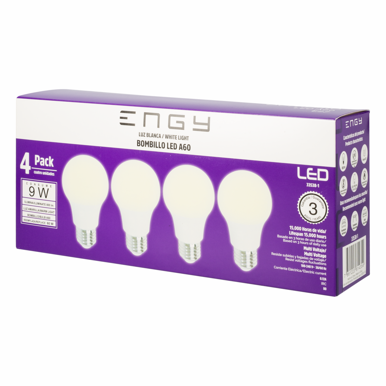 Foco Led A60 E27 9W 100-240V 3000K ENGY Pack 4 Piezas