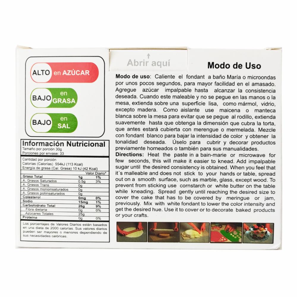• Fondant de color Blanco, preparación elaborada principalmente a base de azúcar, de consistencia suave, elástica y de textura moldeable