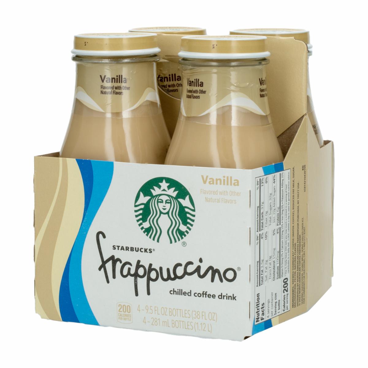 - Bebida de café helado Starbucks Frappuccino de vainilla con otros sabores naturales. Esta bebida es una mezcla de café Starbucks y leche con un toque sabroso de vainilla. Este producto es una buena fuente de proteínas y calcio