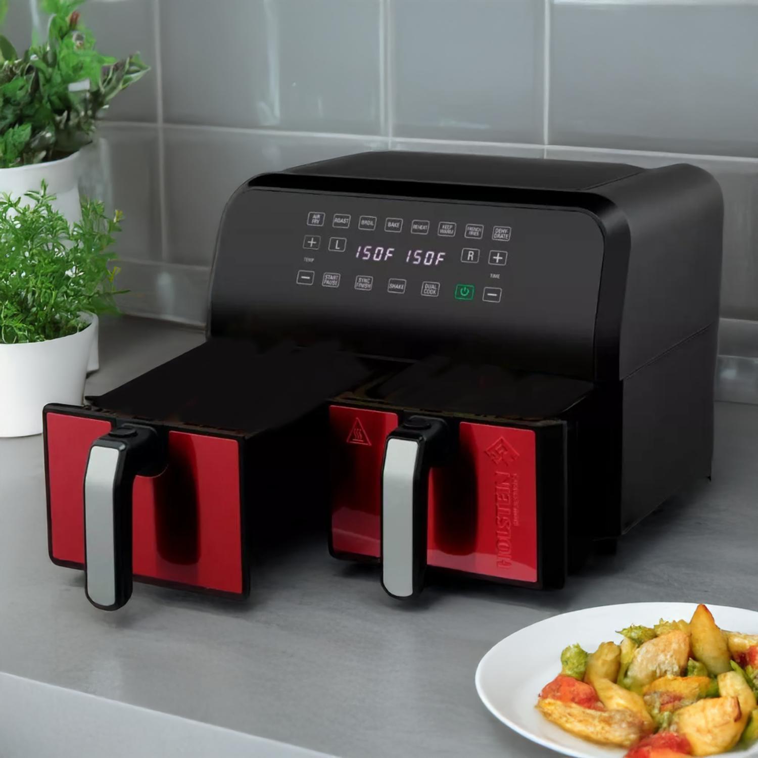- La freidora de aire digital Holstein cuenta con un doble compartimiento que te permite cocinar dos tipos de alimentos diferentes al mismo tiempo, ahorrando tiempo y energía. Además, su capacidad de 7.6 litros es ideal para preparar comidas para toda la familia