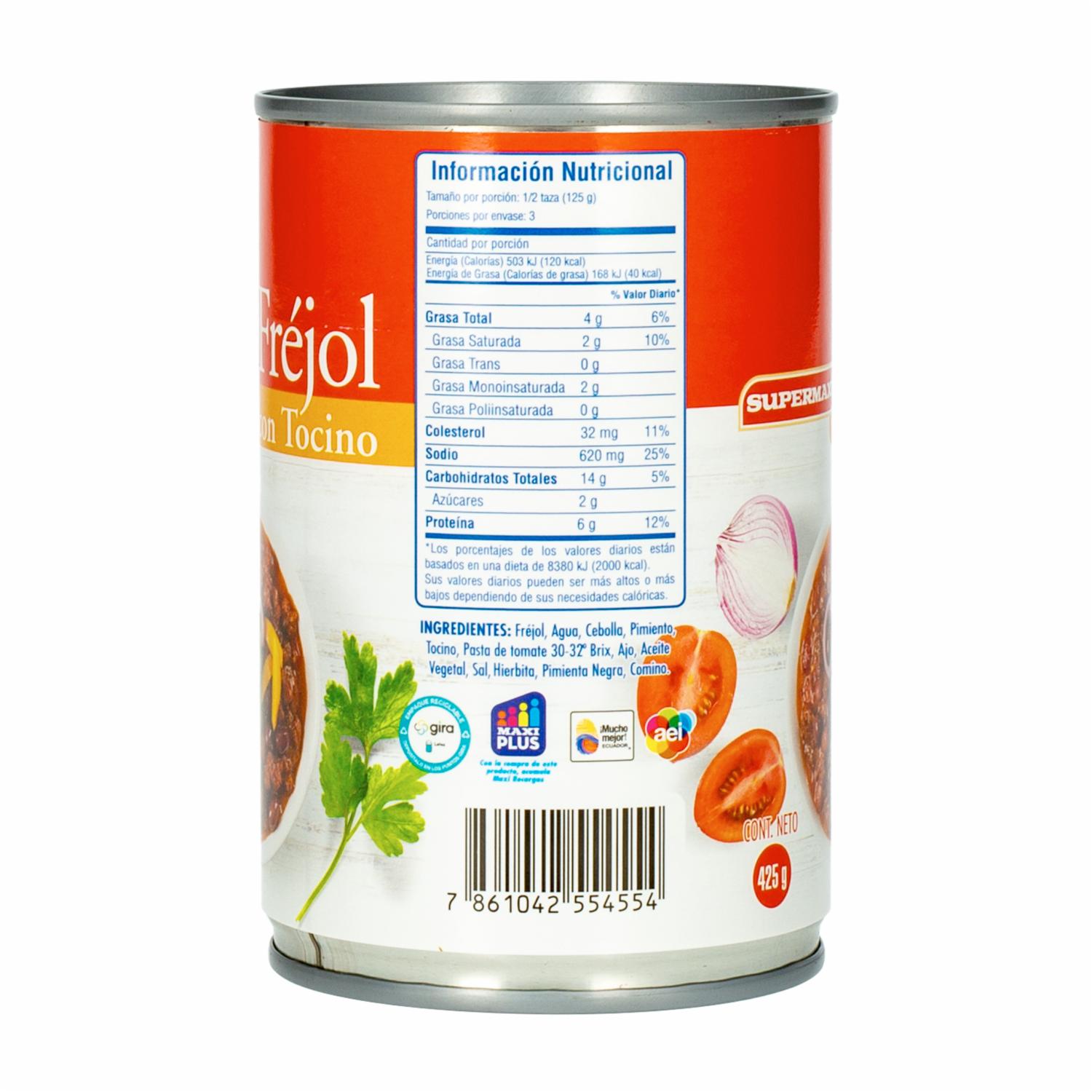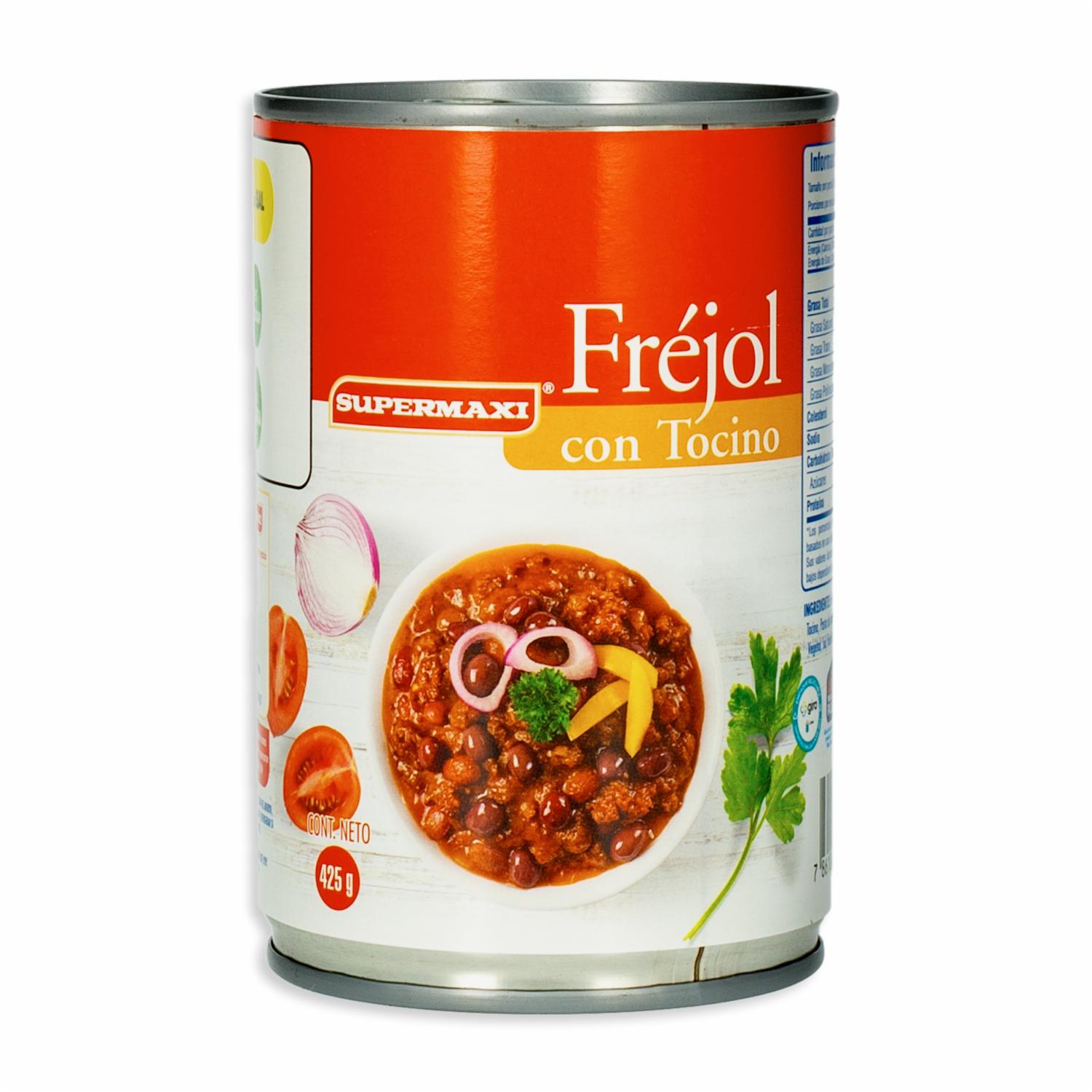 Frejol Con Tocino SUPERMAXI Lata – SUPERMAXI. Disponible en nuestros locales. Precio y stock pueden variar según la tienda.