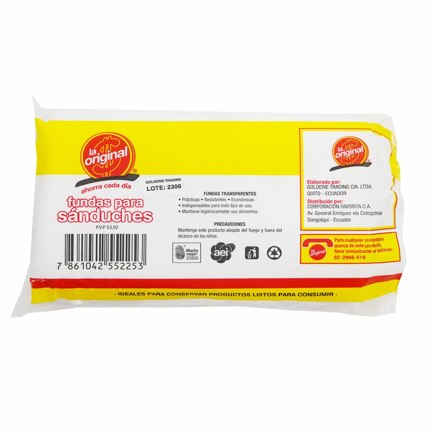 Fundas Para Sánduche LA ORIGINAL Por 300 Uds – LA ORIGINAL. Disponible en nuestros locales. Precio y stock pueden variar según la tienda.