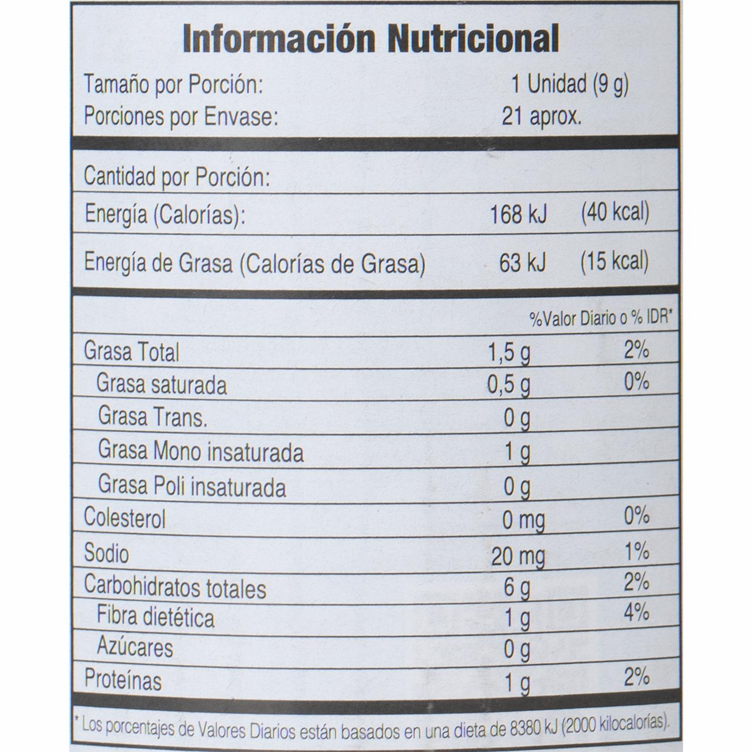 • Gasificantes: bicarbonato sódico (gasificante), bicarbonato amónico (gasificante). Lecitina de girasol (emulgente), sal marina, aromas naturales, antioxidantes (extracto rico en tocoferoles (antioxidante), extracto de (antioxidante) romero* )