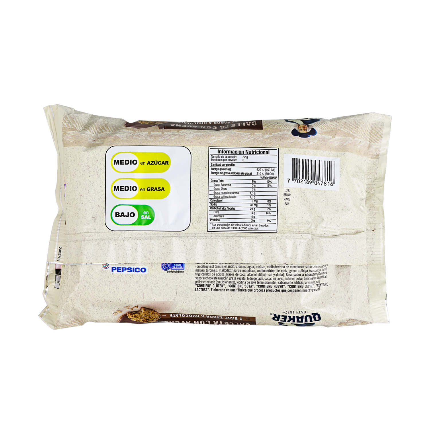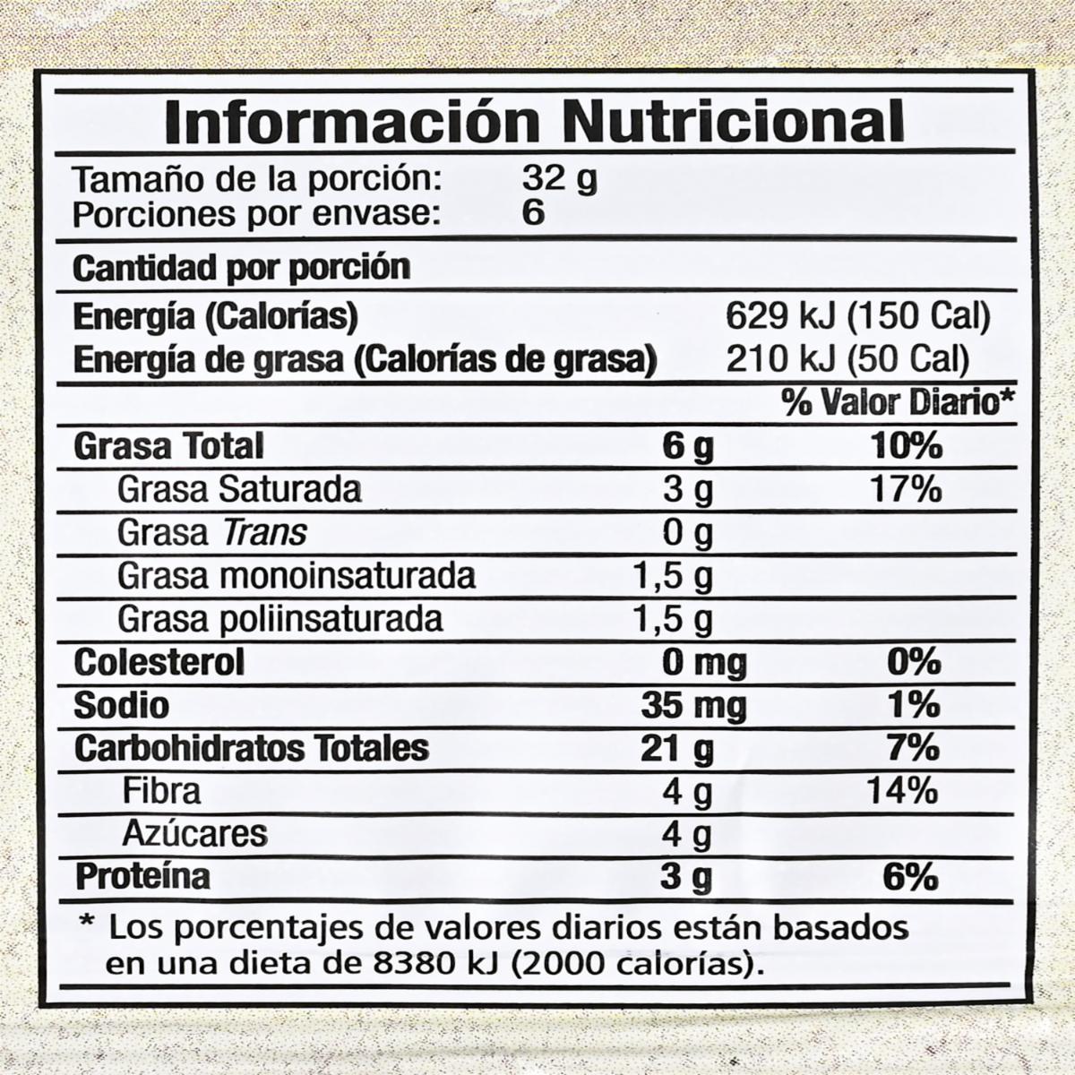 - Contiene avena, que es una fuente de fibra y proteínas. - Contiene chocolate, que le da un sabor dulce y agradable. - Es un snack conveniente para llevar y comer en cualquier momento del día. - No contiene grasas trans y es bajo en grasas saturadas. - Es una opción de snack saludable para personas que buscan cuidar su alimentación