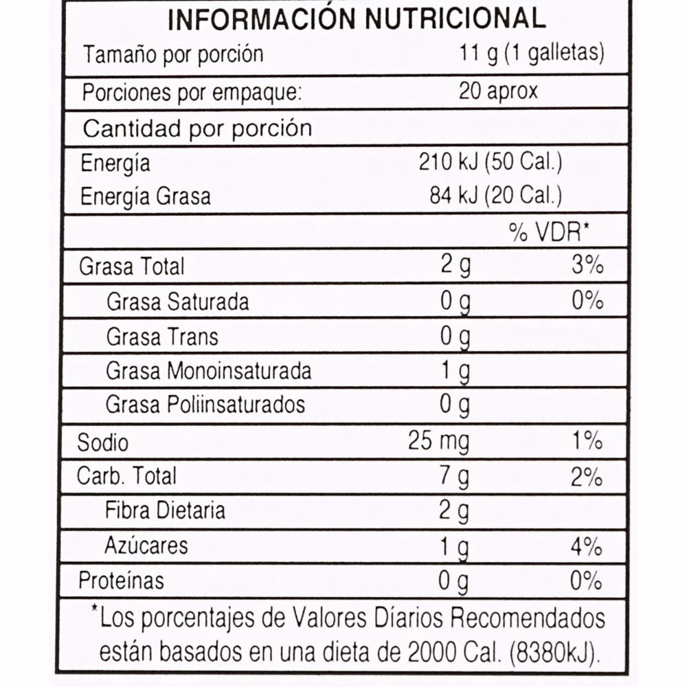 • Ingredientes: Almidón de maíz, pepitas de chocolate (azúcar, pasta de cacao, manteca de cacao, emulgente (lecitina de SOJA), harina de arroz, aceite vegetal (girasol alto oleico), copos de AVENA, azúcar, oligofructosa, polidextrosa, almidón de arroz, sal, gasificantes (carbonato ácido de sodio y carbonato ácido de amonio)