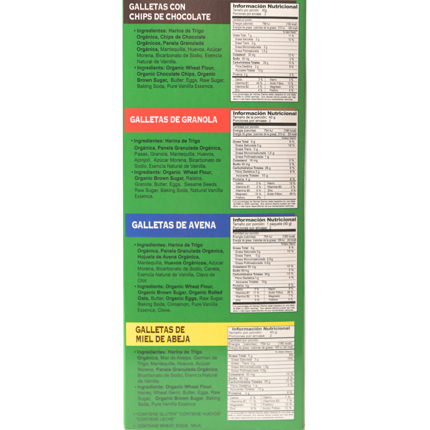- Harina de trigo orgánica, miel de abejas, germen de trigo, mantequilla, huevos, azúcar morena, panela granulada orgánica y esencia natural de vainilla
