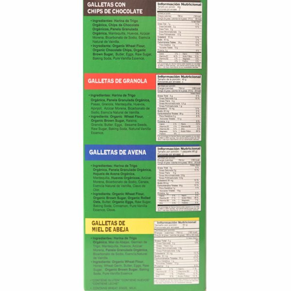 Harina de trigo orgánica, miel de abejas, germen de trigo, mantequilla, huevos, azúcar morena, panela granulada orgánica y esencia natural de vainilla