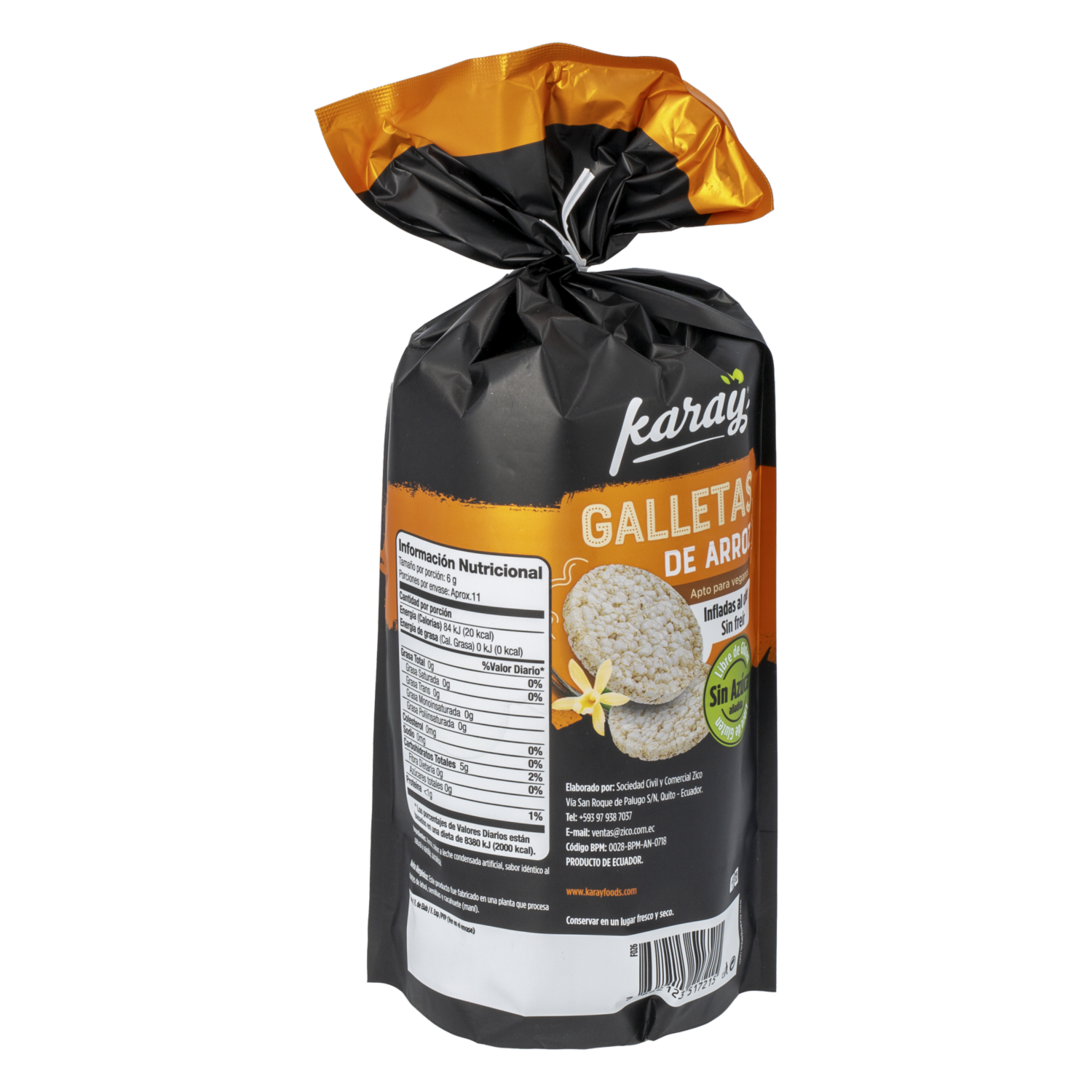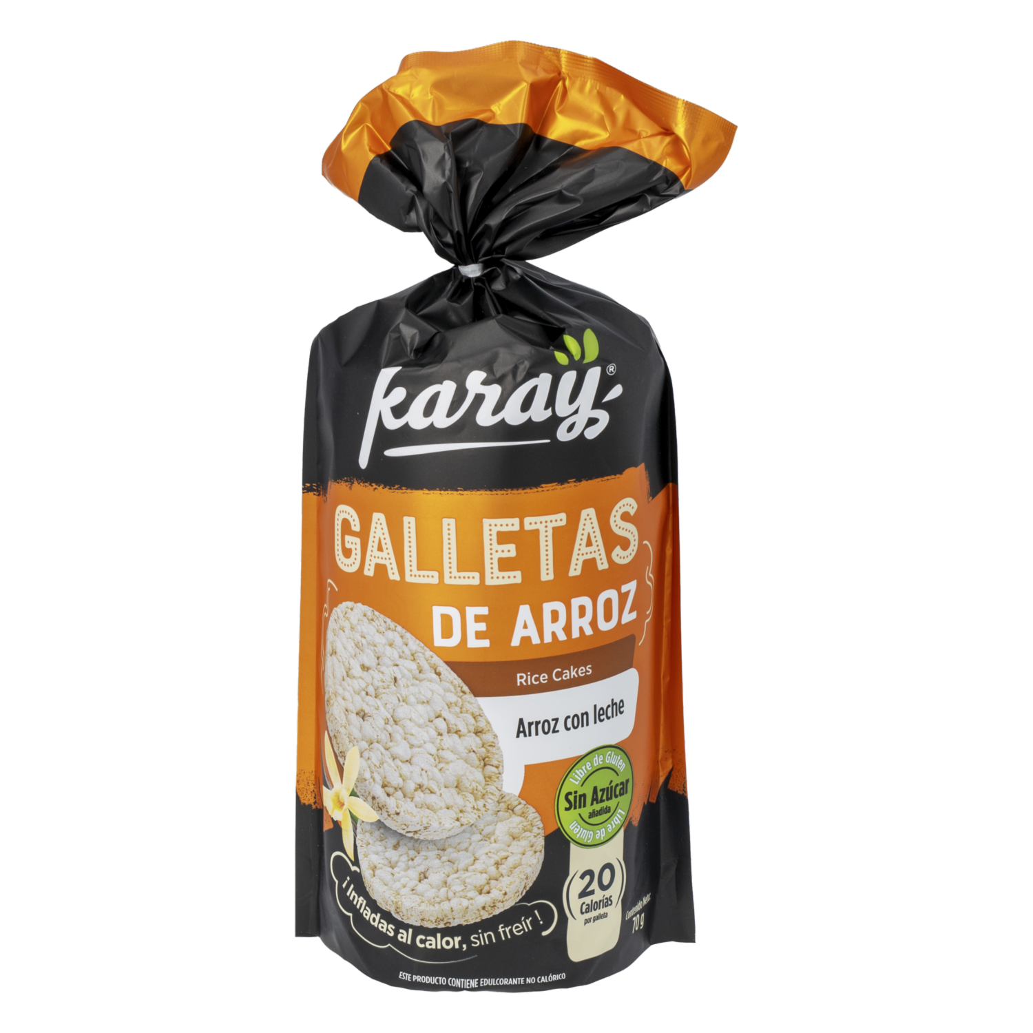 - Galletas de Arroz con Leche Sin Azúcar KARAY 70 G son un snack saludable, liviano y crujiente, hecho a base de arroz, leche (sin azúcar añadida) y otros ingredientes como almidones, que son bajos en calorías y aptos para celíacos (sin TACC). Son ideales para colaciones, desayuno o acompañar comidas, recomendadas por nutricionistas para dietas bajas en calorías o para personas con diabetes, ofreciendo una alternativa sin freír y nutritiva