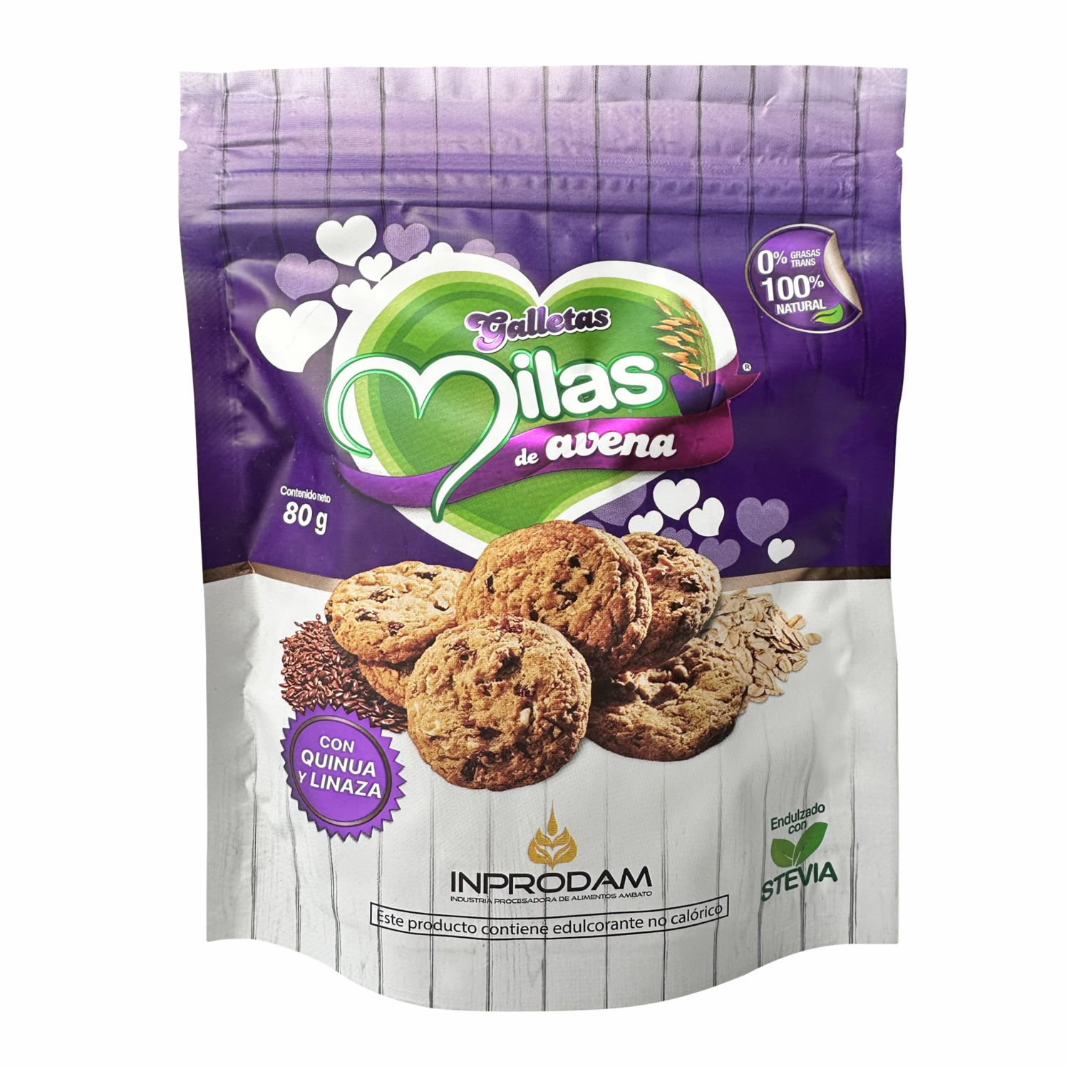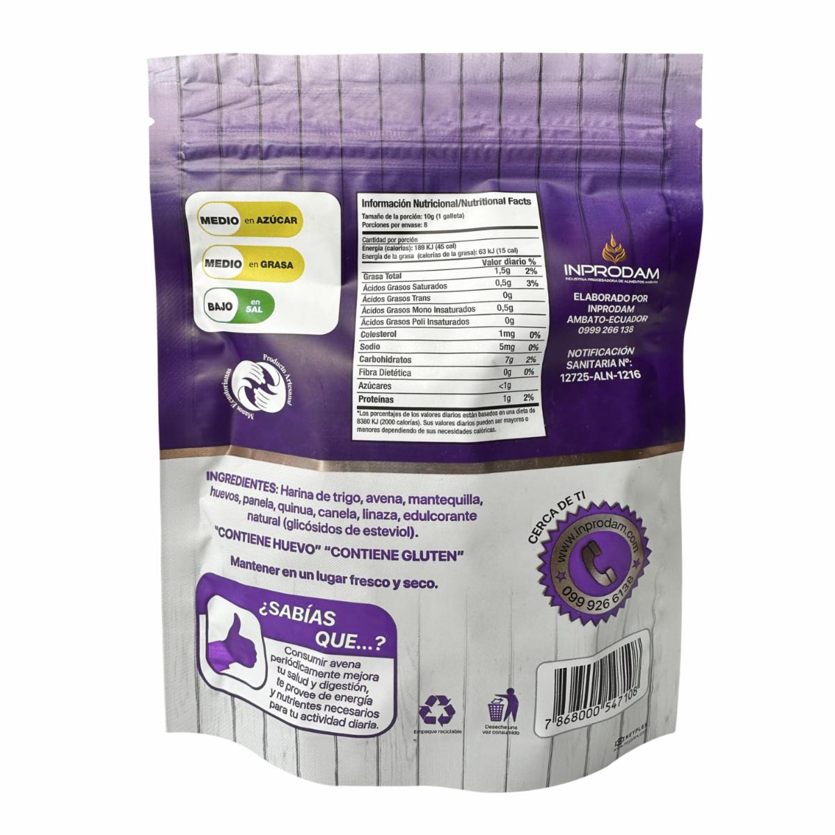 - Deliciosas galletas de avena con quinua y linaza, endulzadas con Stevia, 0% grasas trans, producto 100% natural. Contine harina de trigo, avena, mantequilla, huevos, panela, quinua, canela, linaza, edulcorante natural
