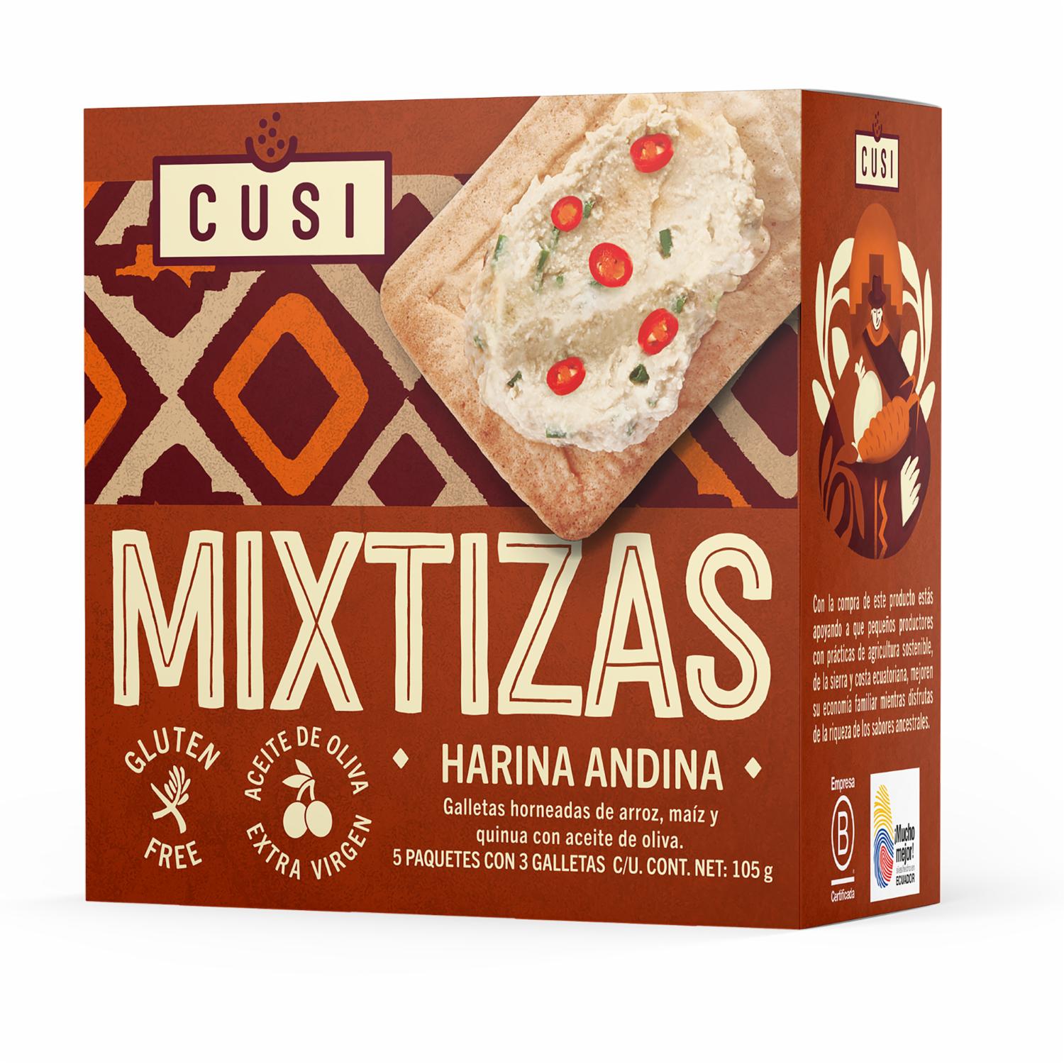 - Mixtizas Harina Andina, Galletas horneadas de arroz, maízy quinua con aceite de oliva. Hechas con ingredientes 100% Ecuatorianos. 5 paquetes con 3 calletas cada uno