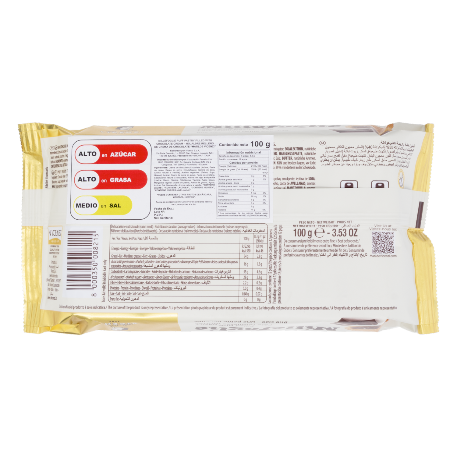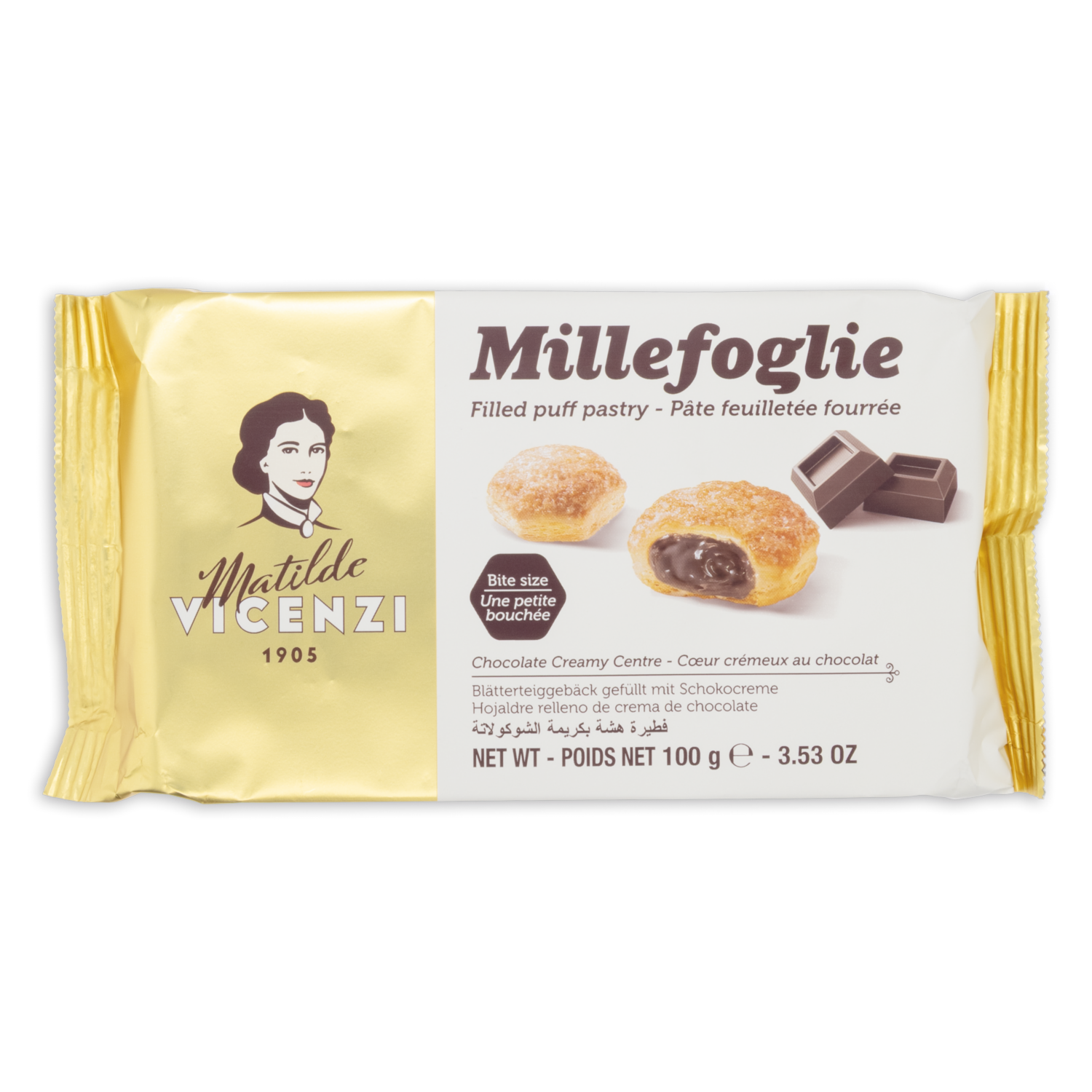 Las Millefoglie Matilde Vicenzi son pasteles de hojaldre italianos rellenos de crema de chocolate, un producto reconocido por su calidad y tradición pastelera desde 1905. El hojaldre es famoso por sus 192 finas y crujientes capas