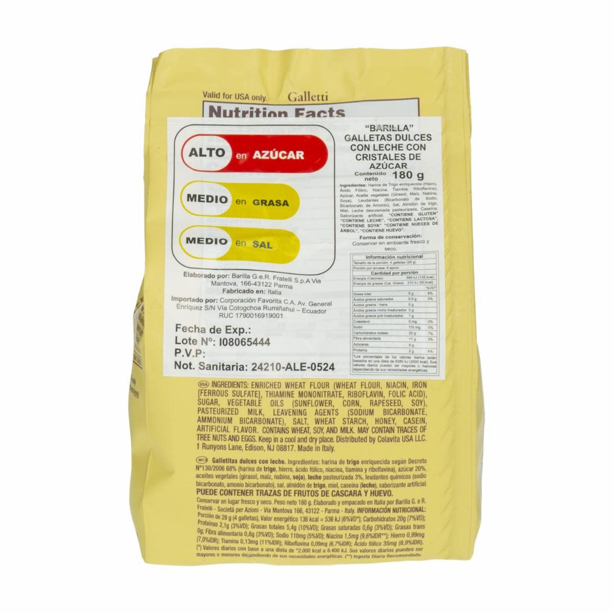 - Las galletas de leche con cristales de azúcar BARILLA, en presentación de 200 g, son un delicioso y crujiente snack ideal para acompañar el café, té o disfrutar solo