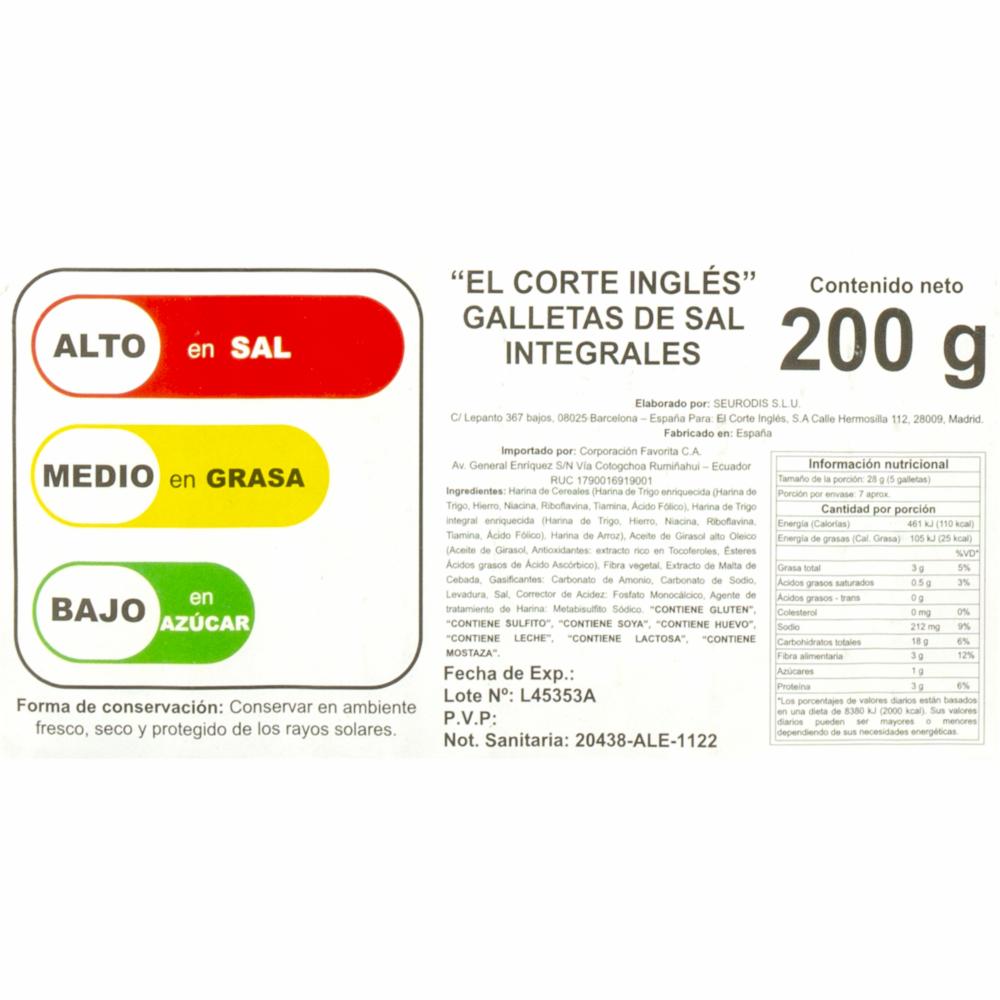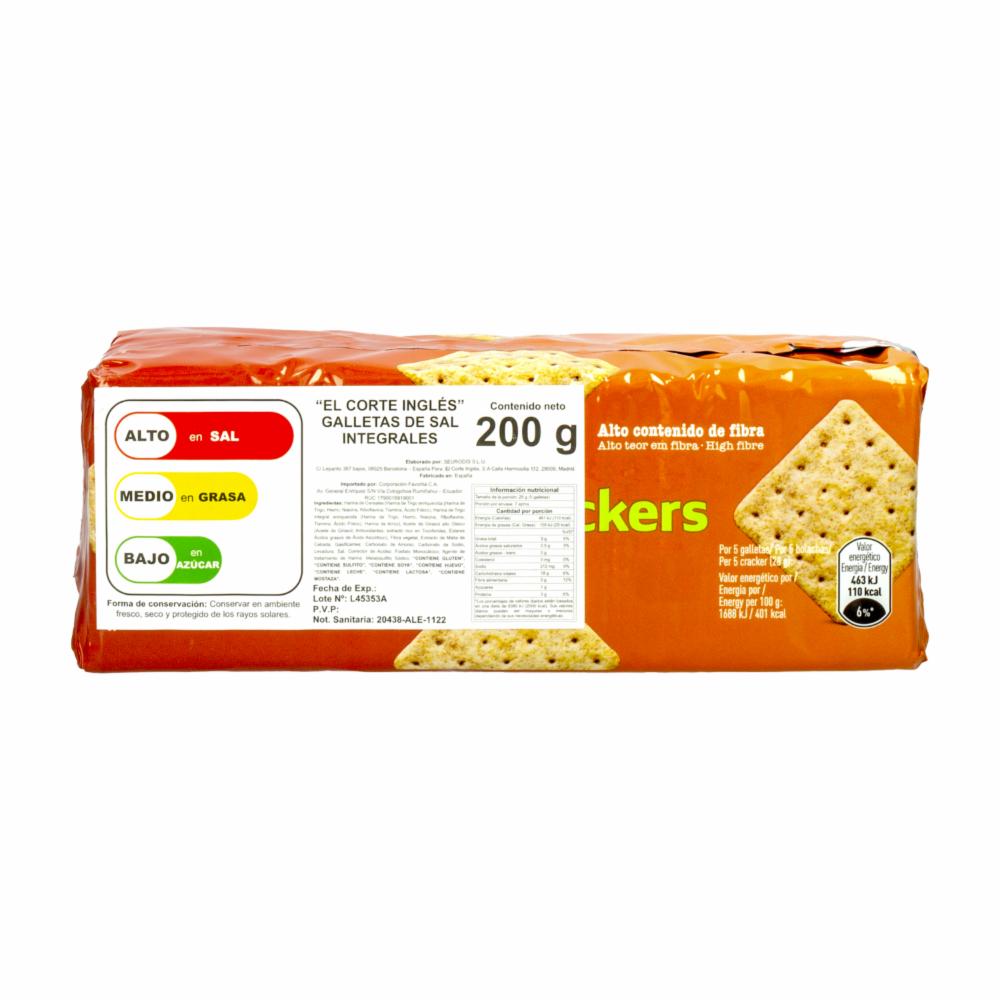 • Las galletas integrales de sal EL CORTE INGLÉS, en presentación de 200 g, son una opción deliciosa y saludable para quienes buscan un snack crujiente y ligero
