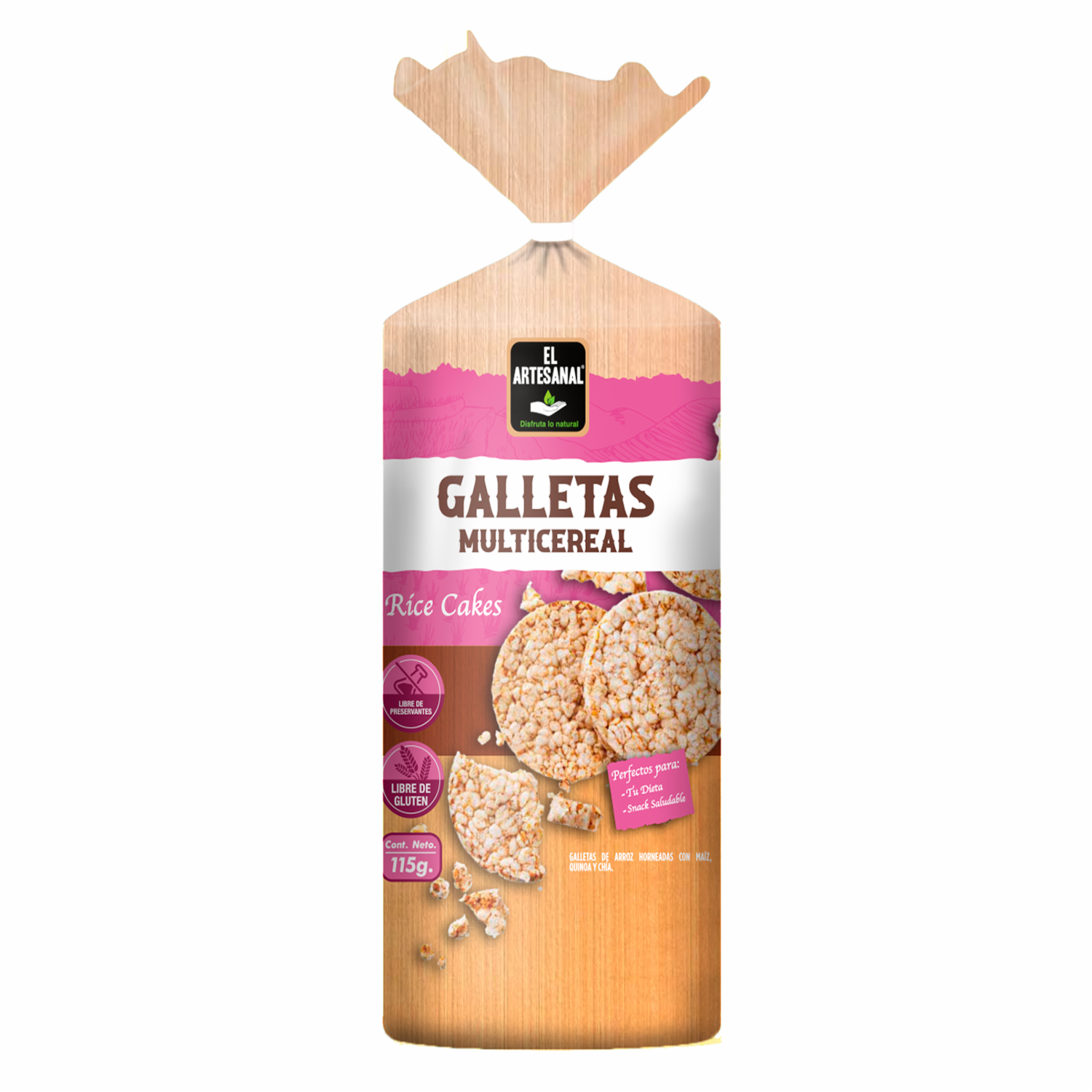 - Las galletas de arroz multicereal El Artesanal son un snack ligero y crujiente hecho con granos integrales como arroz, maíz y quinoa