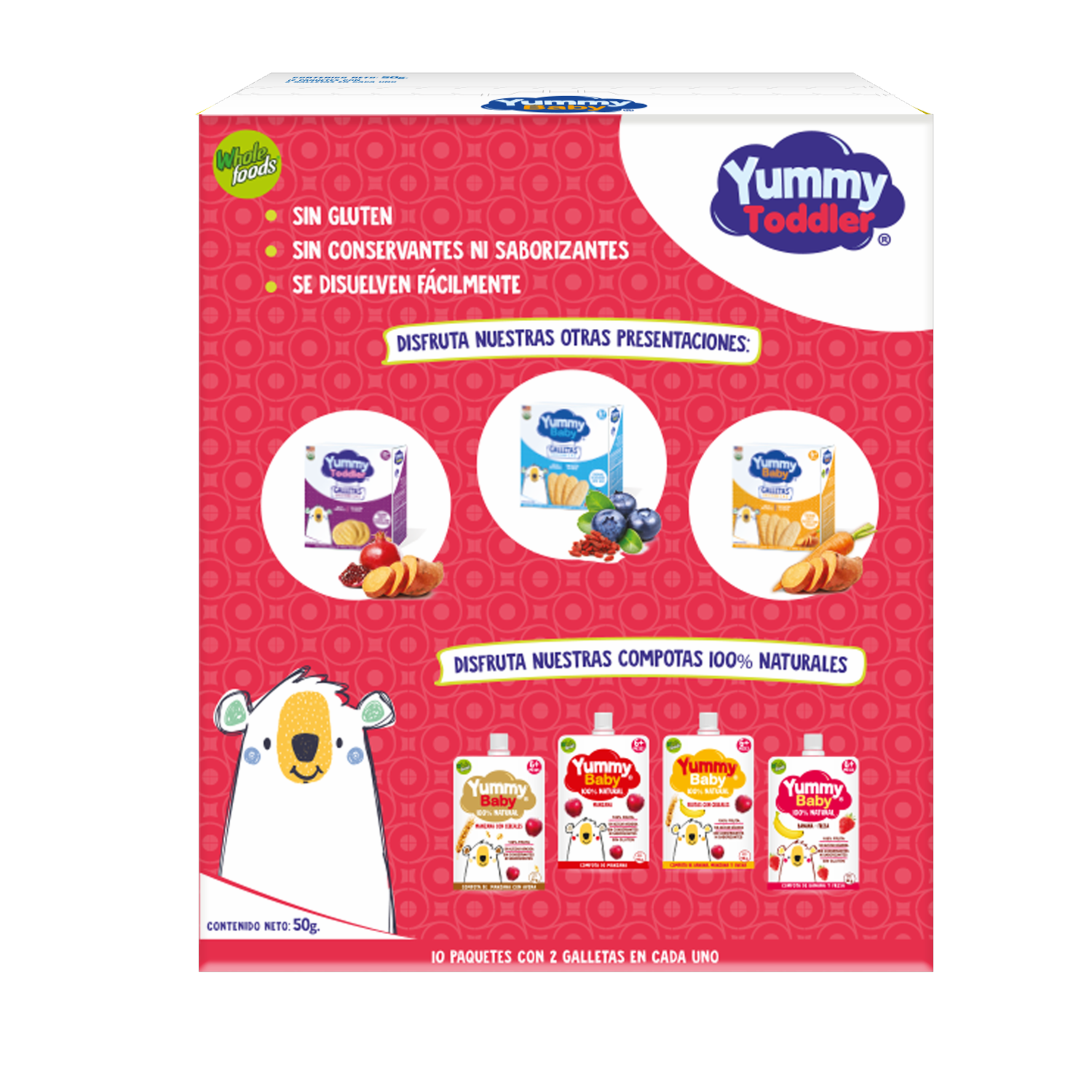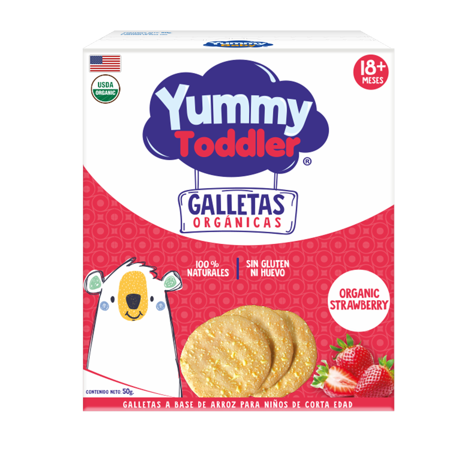 - Las Galletas Orgánicas Strawberry Sin Azúcar de Yummy Toddler, en su presentación de 50 g, son un producto especialmente diseñado para niños pequeños en su etapa de desarrollo. Estas galletas están elaboradas con ingredientes orgánicos y naturales, y están específicamente formuladas para no contener azúcar añadido, lo que las convierte en una opción saludable para introducir a los niños en el mundo de los snacks
