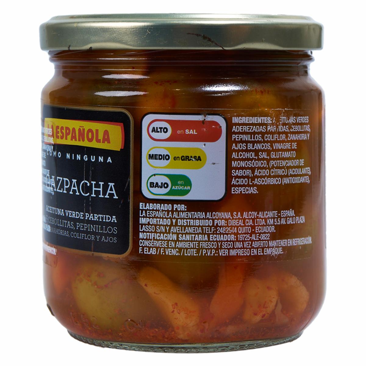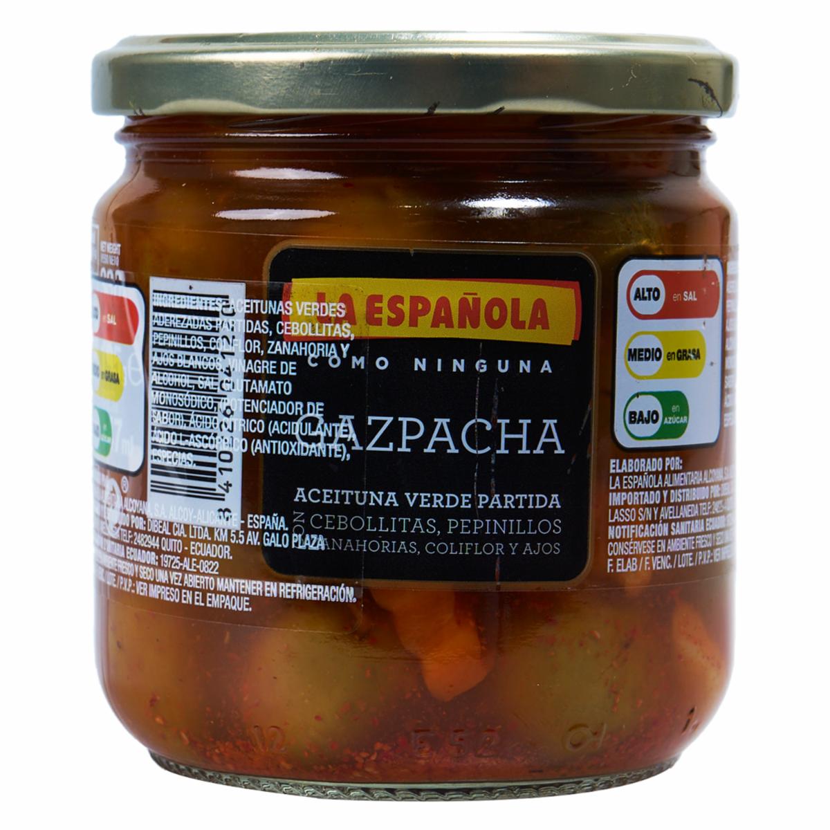 - Gazpacha Con Encurtido LA ESPAÑOLA es una sopa fría refrescante y llena de sabor tradicional. Ideal para acompañar tus comidas o disfrutar como entrada ligera. Su mezcla con encurtidos aporta textura y un toque especial