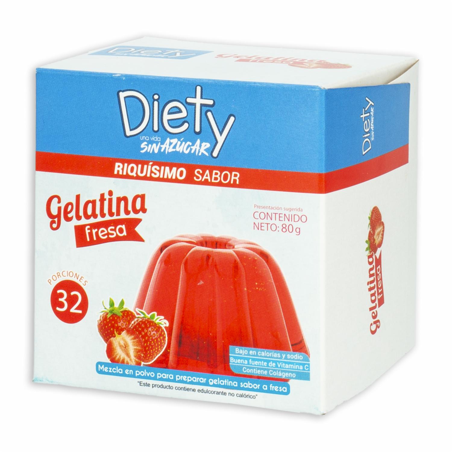 - La gelatina de fresa DIETY de 80 g ofrece un delicioso sabor a fresa en una presentación fácil de preparar. Perfecta para disfrutar como postre o para agregar un toque de frescura a tus comidas, brindando un sabor suave y dulce en cada bocado. Ideal para quienes buscan una opción ligera y sabrosa