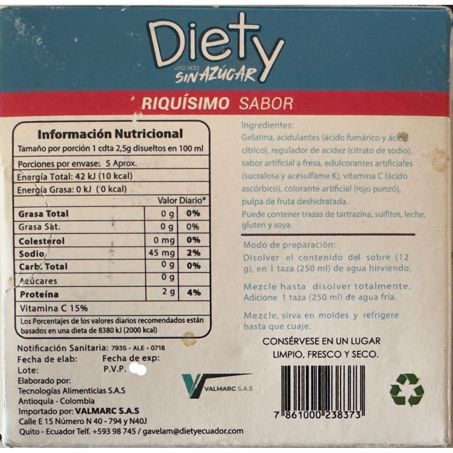 - Gelatina rico sabor, remplaza el azúcar con sucralosa, contiene colágeno, ayuda a las articulaciones. Disolver el contenido en 250 ml de agua