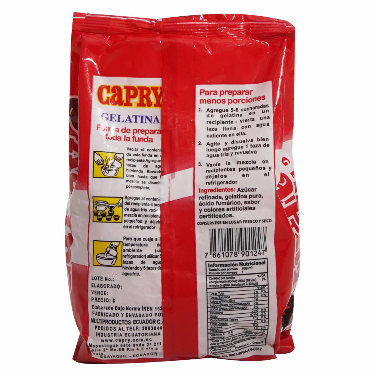 - La gelatina en polvo CAPRY sabor a cereza es perfecta para preparar postres deliciosos y refrescantes. Cada paquete de 500 gramos es ideal para disfrutar en familia y hacer de tus comidas un momento especial