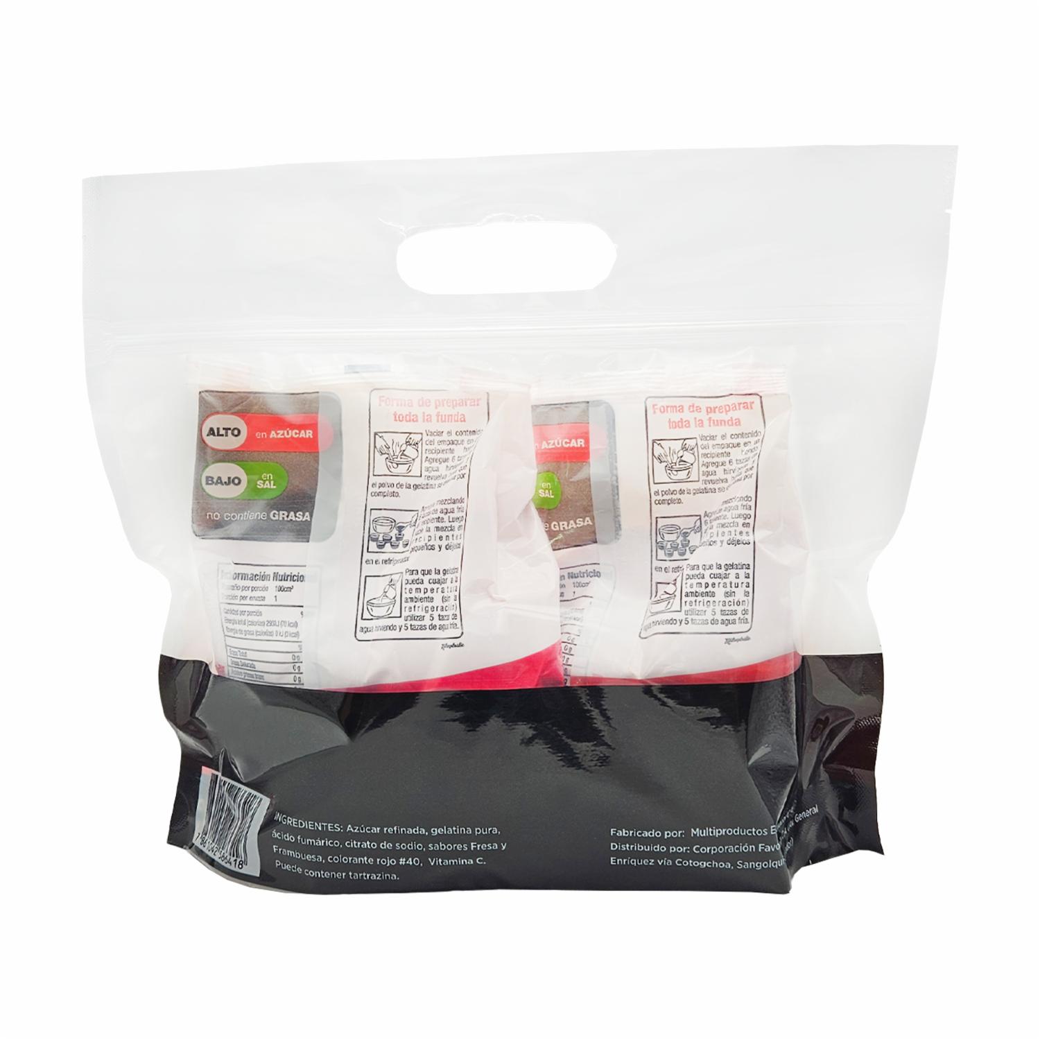 • El pack de gelatina en polvo SMART SELECTION combina los sabores de fresa y frambuesa en una deliciosa mezcla. Cada funda de 500 gramos está elaborada con saborizantes naturales de fresa y frambuesa y colorantes artificiales, sin conservantes