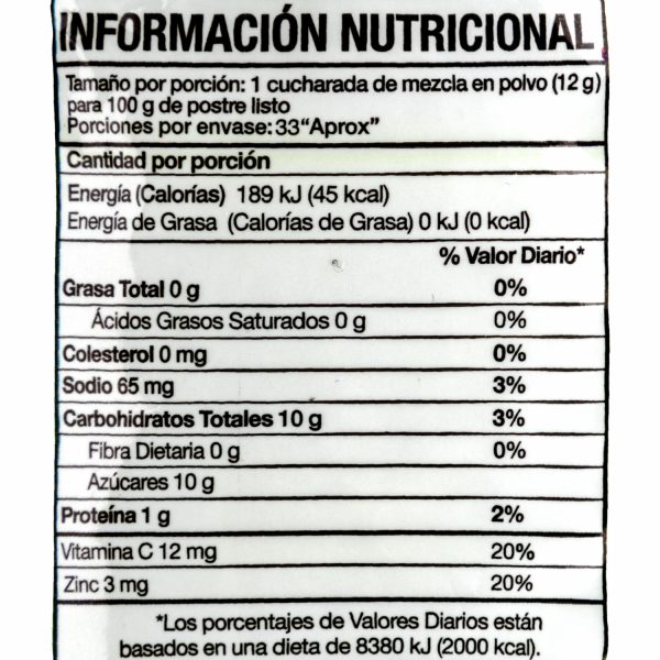 • Mezcla en polvo para preparar gelatina con sabor artificial a frutas