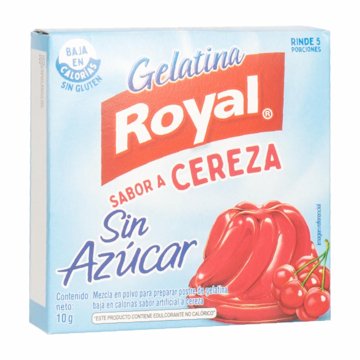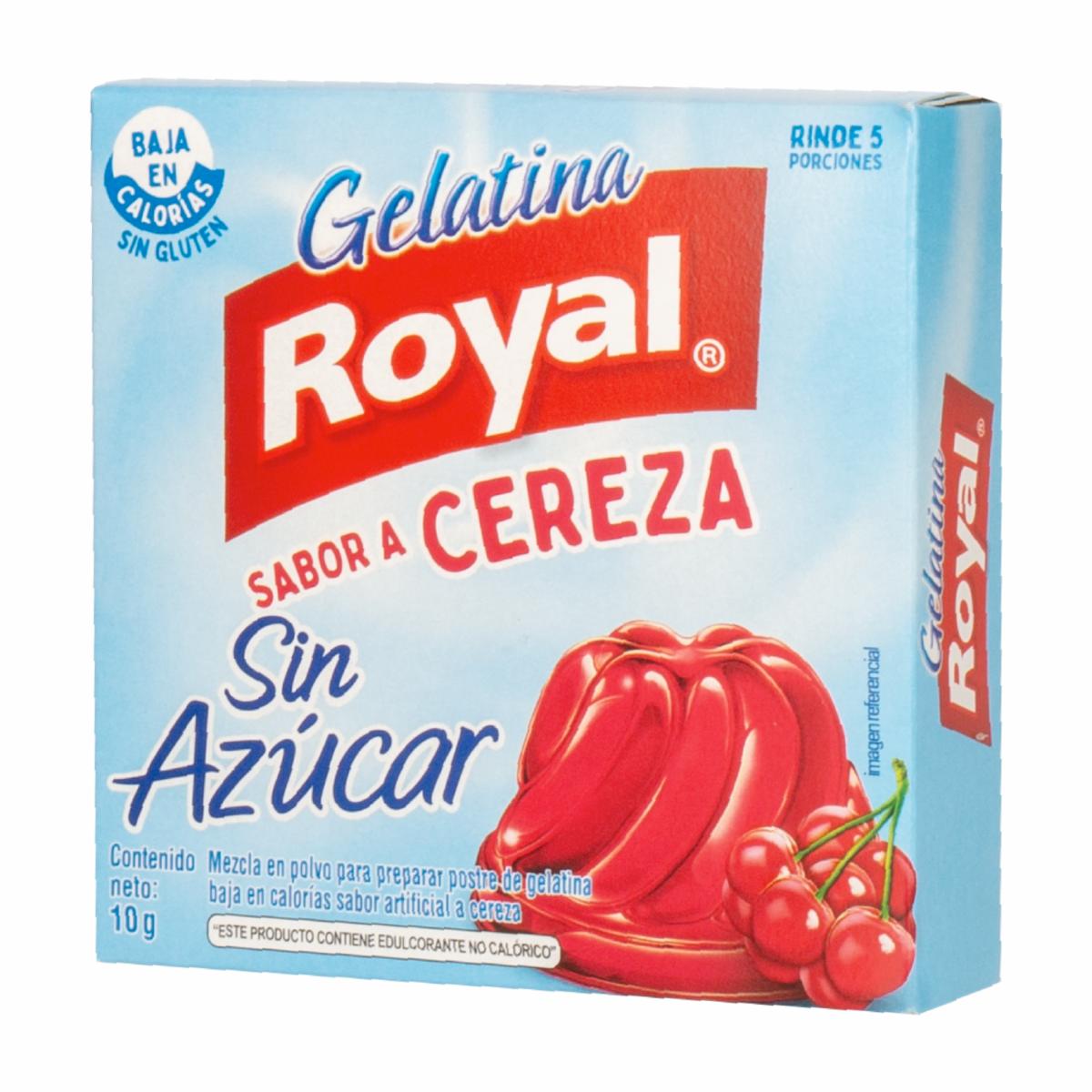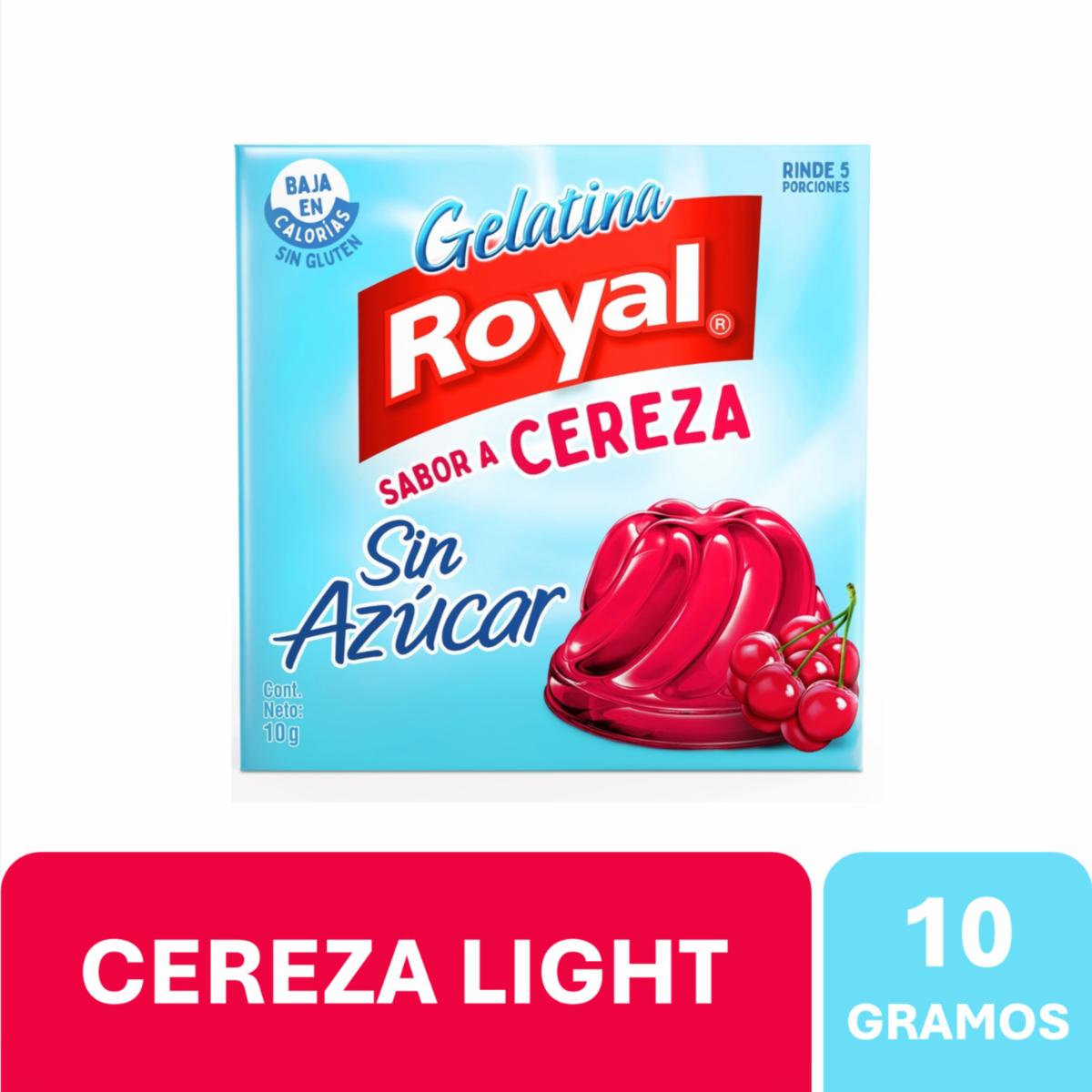 • Gelatina light baja en calorías sabor a Cereza en formato 10g. Para los grandes y pequeños amantes de la gelatina de frutas. Las gelatinas Royal son ideales para compartir con amigos, niños y familia en cualquier ocasión especial, postres, meriendas, fiestas o celebraciones. También las puedes utilizar como ingrediente en tu receta de cocina favorita como tartas, gominolas, helados o pasteles