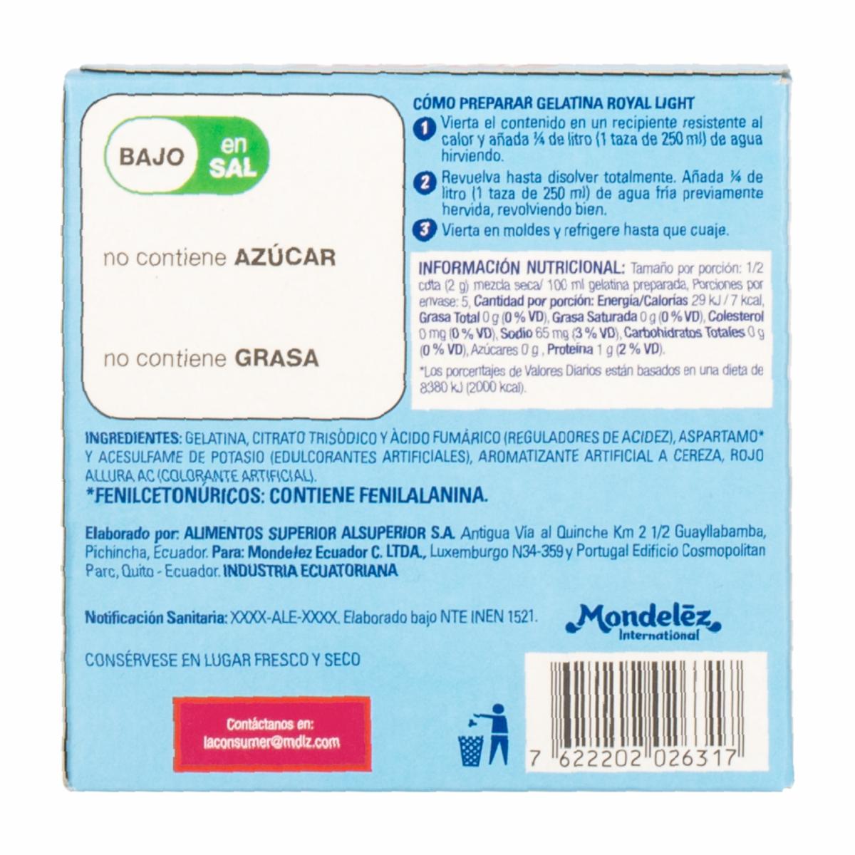 Gelatina Light Sabor Cereza ROYAL 10 G – ROYAL. Disponible en nuestros locales. Precio y stock pueden variar según la tienda.