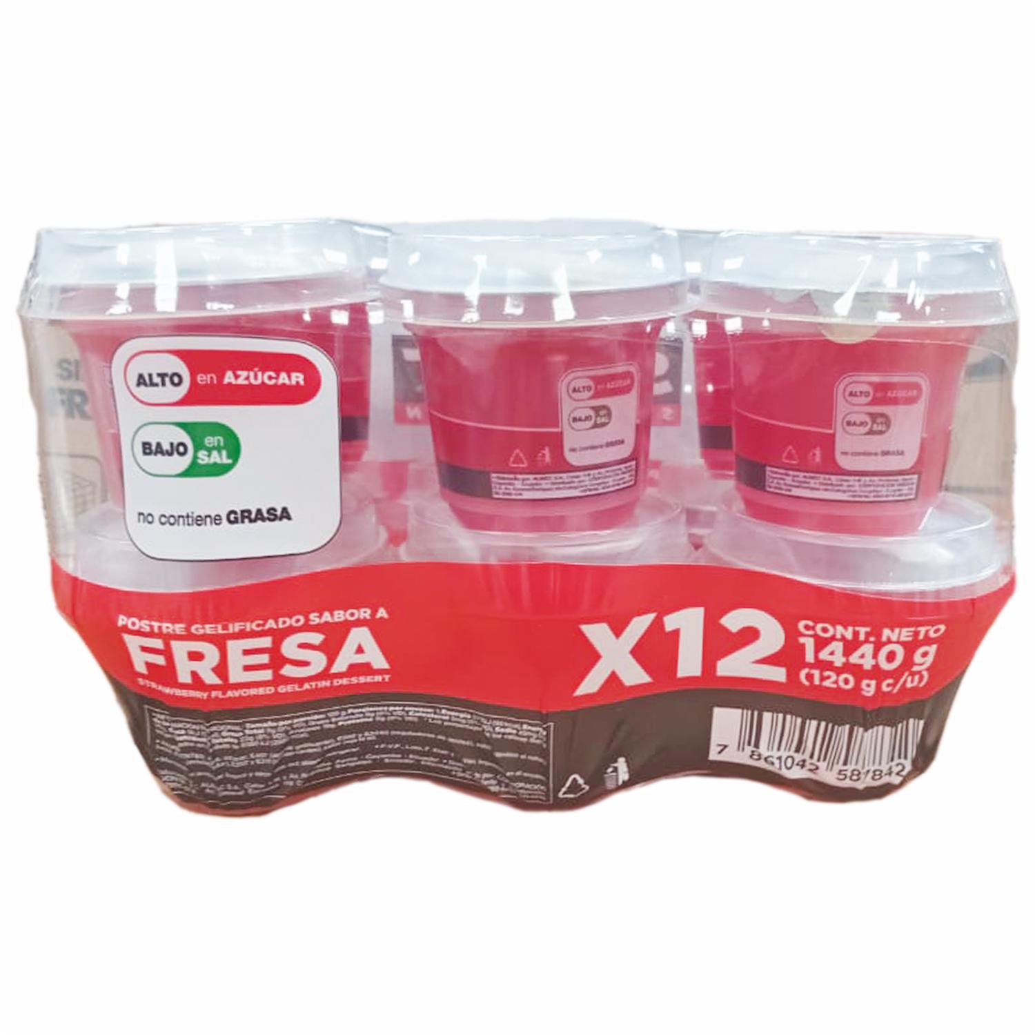 - ¡Disfruta de la frescura y el sabor jugoso de nuestra Gelatina Lista Sabor a Fresa en Vaso Smart Selection, ahora en un práctico paquete de 12 unidades! Cada vaso de 120g está lleno de deliciosa gelatina, perfecta para satisfacer tus antojos de manera rápida y conveniente