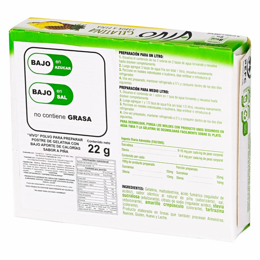 Gelatina Piña VIVO Caja – VIVO. Disponible en nuestros locales. Precio y stock pueden variar según la tienda.