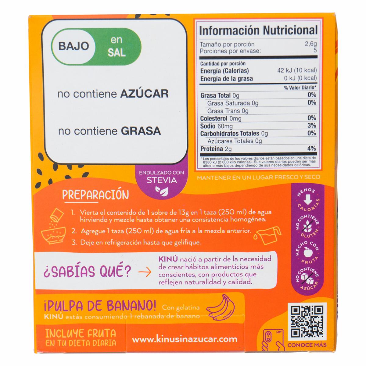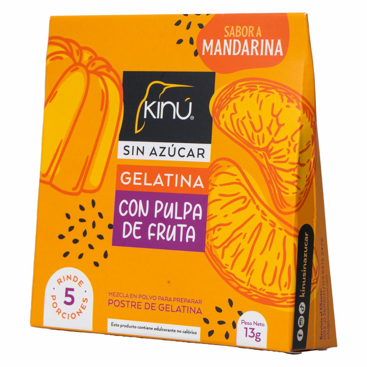 - Mezcla en polvo para preparar gelatina kinú sin azúcar con pulpa de fruta sabor: mandarina. todos los productos kinú son libres de azúcar añadido. Aptos para personas con diabetes