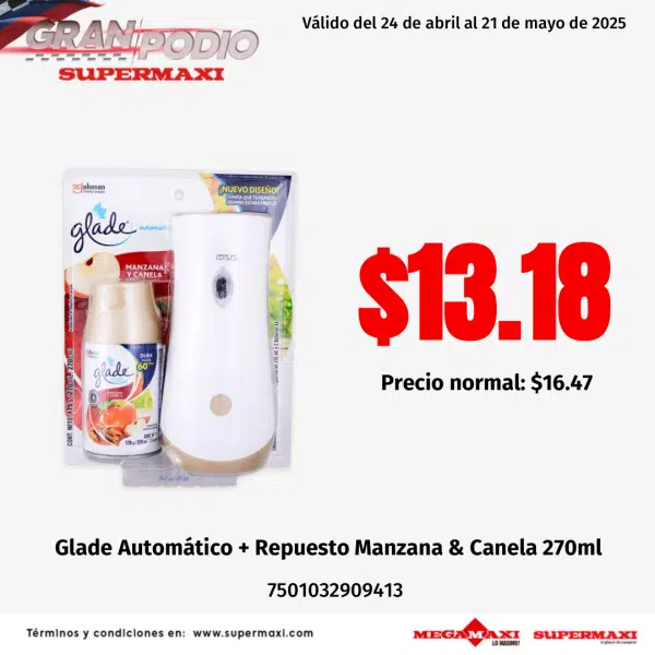 Desodorante Ambiental Automático + Repuesto A Manzana Y Canela GLADE 270 Ml – GLADE. Disponible en nuestros locales. Precio y stock pueden variar según la tienda.