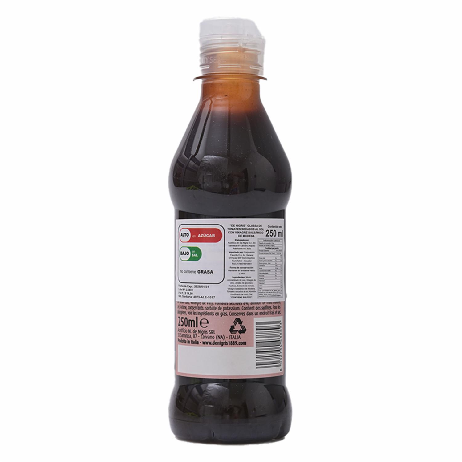 - - Vinagre balsámico De Nigris: Este producto utiliza vinagre balsámico de la reconocida marca De Nigris, que es conocida por su calidad y sabor