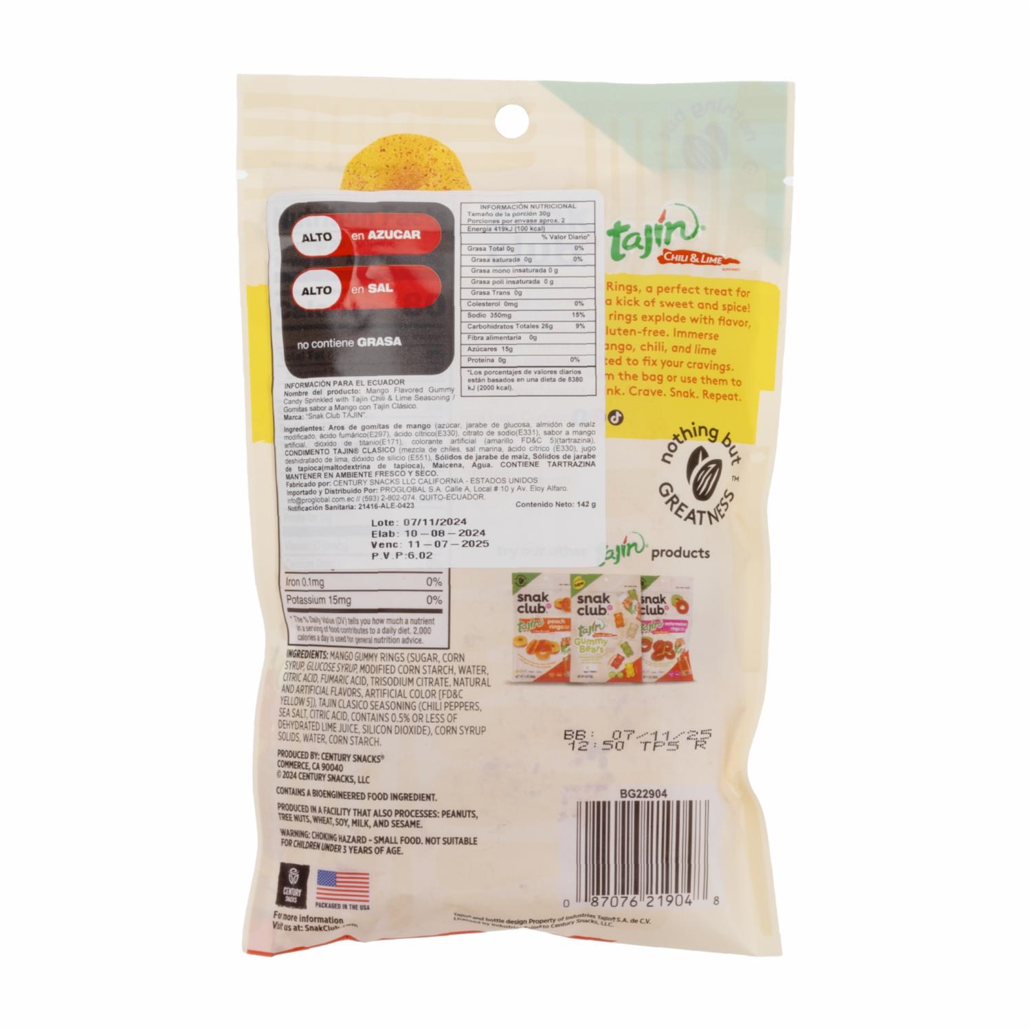 Las "Gomas Aros Mango Tajín" son gomitas con forma de aros con sabor a mango que han sido sazonadas con la mezcla de condimentos Tajín, que incluye chile, sal y limón