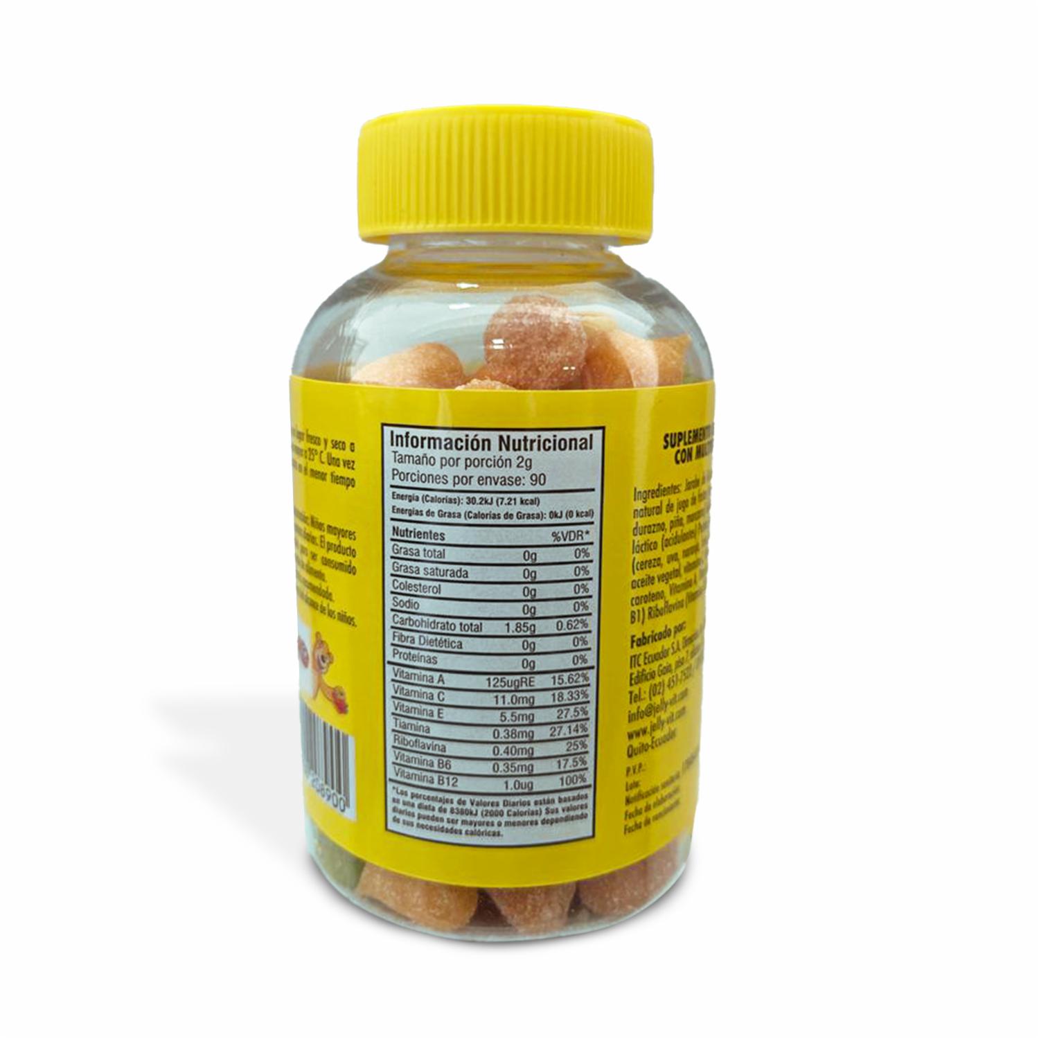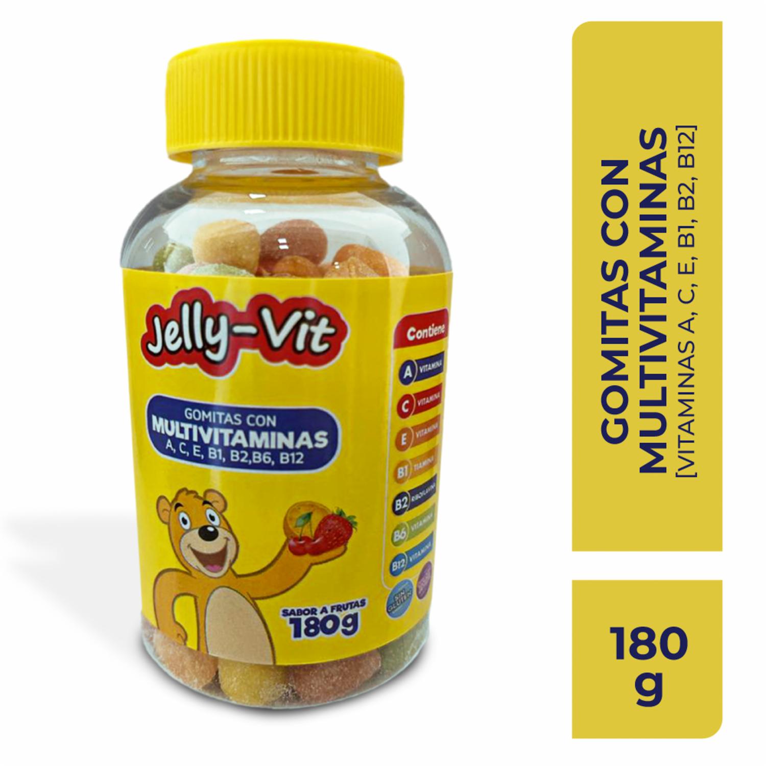 Jelly-vit son Gomitas Masticables Recubiertas De Azúcar, Enriquecidas Con Multivitaminas A, C, E, B1 (tiamina), B2 (riboflavina), B6 Y B12.  cada Frasco Tiene Un Peso De 180 G. ideal Para Niños Mayores De 2 Años No Contienen Gluten. son Ideales Para Complementar La Dieta Diaria De Los Niños