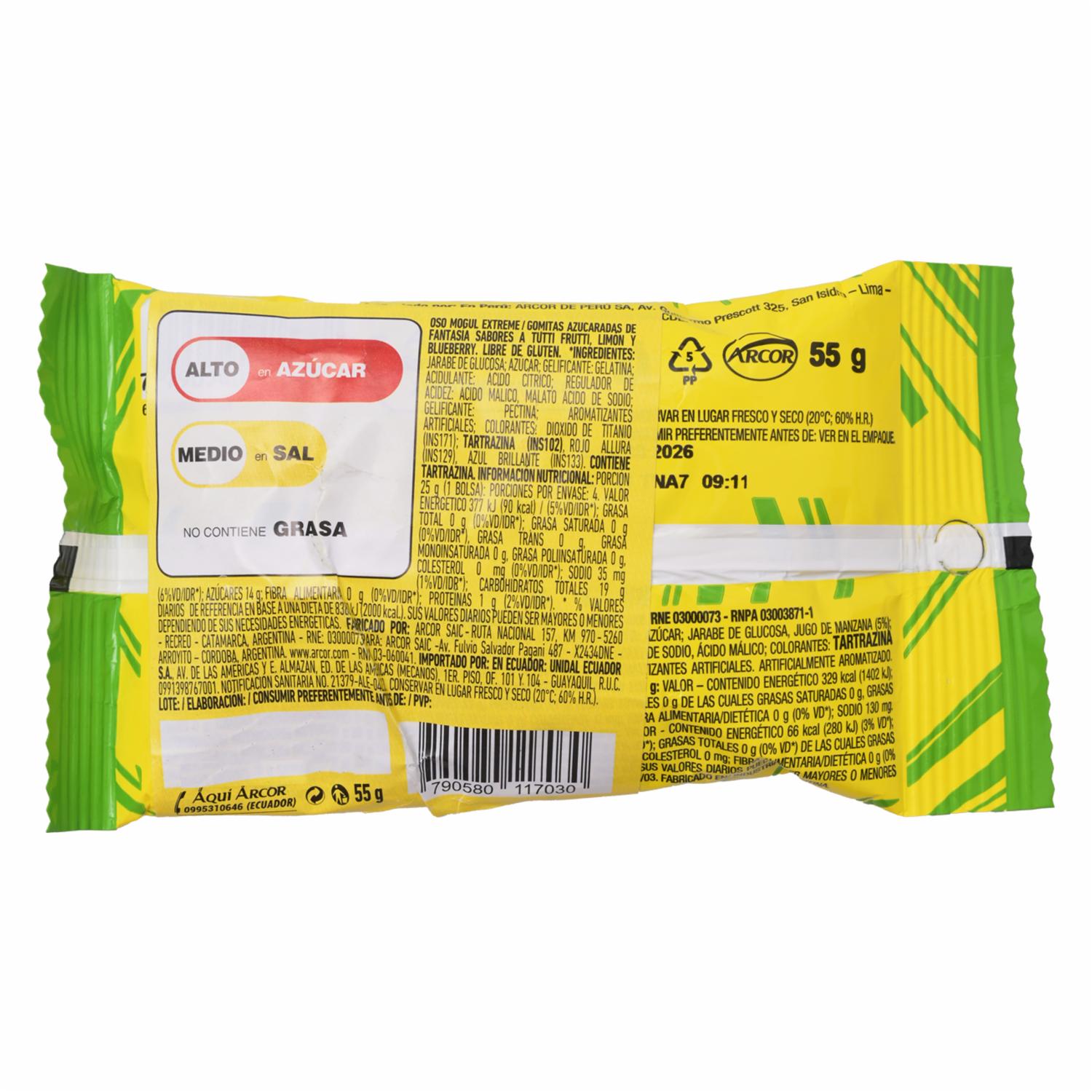 - ¡Una explosión de sabor en cada bocado! Las gomitas Ositos MOGUL EXTREME combinan una textura suave y masticable con un equilibrio perfecto entre lo dulce y lo ácido. Con sabores intensos a tutti frutti, limón y blueberry, estas gomitas ofrecen una experiencia única para los amantes de los sabores vibrantes